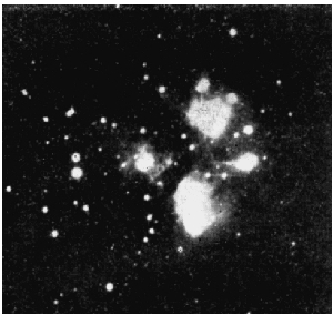 Рис. 6. Рассеянное скопление Плеяды. Кроме звезд, в скоплении видны входящие в его состав газовые облака нии можно насчитать семь звезд. Наблюдая в телескоп, можно увидеть не менее сотни звезд. В телескоп можно наблюдать и газовые туманности. Плеяды показаны на рисунке 6. На фото кроме звезд видны и входящие в их состав газовые облака. Кроме одинарных рассеянных скоплений звезд есть и двойные, например скопление h и с Персея. Оно показано на рисунке 7. В этом двойном рассеянном скоплении содержится около 600 звезд. Красные и желтые гиганты в таких скоплениях встречаются крайне редко. Зато белые и голубые гиганты являются обязательными членами рассеянных скоплений. И это несмотря на то, что они сами по себе являются редкими звездами. Есть и другие редкие звезды — белые и голубые сверхгиганты. Это звезды высокой температуры и очень высокой светимости. Каждая из таких звезд излучает энергии в сотни тысяч и даже в миллионы раз больше, чем наше Солнце. Так вот, и эти редкие звезды чаще всего можно найти в рассеянных скоплениях. Во всяком случае, чаще, чем в других местах Галактики. Рассеянные скопления звезд — это не просто группы звезд, которые оказались рядом. Эти звезды обладают общими свойствами. Например, связь между показателями цвета этих звезд и их светимостью очень своеобразна. На рисунке 8 представлена диаграмма цвет — видимая звездная величина для Плеяд. Особенность этих звезд состоит в том, что практически все они ложатся на
