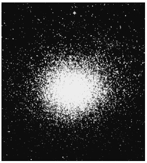 Рис. 10. Система рассеянных скоплений Галактики при наблюдении Галактики с ребра тики, либо очень близко прижаты к ней. На рисунке 10 рассеянные скопления звезд в нашей Галактике находятся в одной плоскости. В настоящее время специалисты зарегистрировали восемьсот рассеянных скоплений звезд в Галактике. Но это не предел. Ведь даже в телескоп мы можем различать только относительно близкие рассеянные скопления. Что касается далеких рассеянных скоплений звезд, то они практически неразличимы. Их трудно зафиксировать, поскольку в них мало видимых звезд. Специалисты считают, что число рассеянных звездных скоплений в Галактике не менее 30 000. Сколько же в них звезд? Если полагать, что в одном рассеянном скоплении примерно 300 звезд, то общее число звезд в них приблизительно равно десяти миллионам. Поскольку в Галактике всего около ста миллиардов звезд, то в рассеянные скопления входит только одна сотая процента всех звезд Галактики. В Галактике есть и более многочисленные коллективы звезд. Таковыми, например, являются шаровые звездные скопления. В каждом из таких скоплений находятся сотни тысяч, а иногда и более миллиона звезд. На рисунке 11 показана фотография шарового скопления то Центавра. Видно, что по мере удаления от края свет от звезд сливается и различить отдельные звезды невозможно. Но это на фотографии. А на самом деле даже в центральных областях шаровых скоплений расстояния между звездами огромны по сравнению с размерами самих звезд. Конечно, в центре шаровых скоплений звезды располагаются значительно ближе друг к другу, чем, на-