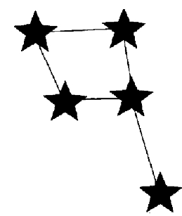 Рис. 77. Группа звезд, расположенных рядом с Альтаиром, образует созвездие Дельфина неба Вега («ваки») — это арабское имя птицы гриф. Созвездие Орла показано на рисунке 76. Самая яркая звезда в нем — Альтаир (летящий орел). Орел — божественная птица. Она принадлежала самому Зевсу. Этот орел похитил Ганимеда. Созвездие Дельфина показано на рисунке 77. Бог моря Посейдон влюбился в дочь Нерея Амфитриту. Амфитрита скрылась от Посейдона у титана Атласа. Посейдону помог дельфин и тот похитил Амфитриту. За эту помощь Посейдон поместил дельфина на небо. |
