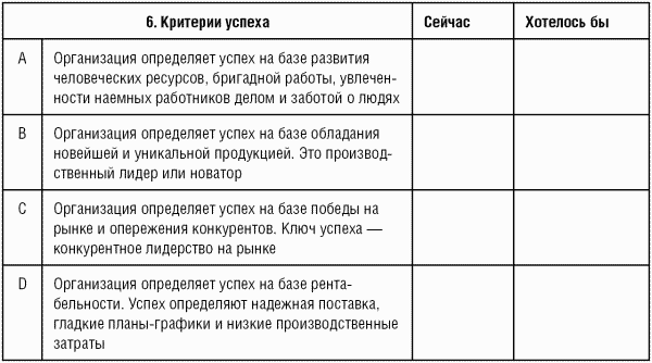 ![]() Рис. 3.3. Шаблон для построения графических результатов по измерению и диагностики профиля организационной культуры Это исследование позволит провести детальный анализ по каждому из шести важнейших характерных особенностей конкретной организации. Также оно даст возможность понять, на что следует обратить особое внимание, что требует скорейшего изменения, и позволит сопоставить нынешнюю ситуацию с желаемой идеальной моделью. При этом возможно в кратчайшие сроки подобрать необходимые инструменты и способы реорганизации по каждому направлению. Например, по результатам проведенного анализа вы можете получить следующее графическое изображение (рис. 3.4). (Фактическое состояние обозначается сплошной линией; желаемое – пунктирной.) ![]() Рис. 3.4. Графическое изображение профиля организационной культуры Как мы видим, вершины углов находятся сразу в двух квадратах, что свидетельствует об уклоне в сторону иерархической модели внутриорганизационного устройства и одновременно о таком же уклоне в сторону рыночной модели. При проведении разъясняющего интервью заполнивший анкету сотрудник указал следующие характеристики компании. Очень формализованное и структурированное место работы. Тем, что делают люди, управляют процедуры. Критически важно поддержание плавного хода деятельности организации. Организацию объединяют формальные правила и официальная политика. Ее долгосрочные заботы состоят в обеспечении стабильности и показателях плавного хода рентабельного выполнения операций. Репутация и успех являются общей заботой. Фокус перспективы настроен на конкурентные действия, решение поставленных задач и достижение зримых целей. Успех определяется в терминах проникновения на рынки и рыночной доли. Важны конкурентное ценообразование и лидерство на рынке. Стиль организации – жестко проводимая линия на конкурентоспособность. Критически важные моменты. • Управление системой контроля. • Управление конкурентоспособностью. • Стимулирование активности наемных работников. • Управление обслуживанием потребителей. Роли лидерства. Боец. Личность агрессивная и решительная. Лидерство основано на управлении информацией. Активно поощряются документирование и информационный менеджмент. Достижение победы – доминирующая цель, фокус внимания – на внешних конкурентах и позиции на рынке. Активно поощряются контроль и продуктивность. В основании его влияния лежат инжиниринг по ситуации, управление календарными графиками, распределение назначений, размещение ресурсов и т. д. Критерии эффективности. • Рентабельность. • Гладкое функционирование. • Рыночная доля. • Поражение конкурентов. Теория менеджмента. Контроль способствует рентабельности. При этом, по мнению данного сотрудника, более эффективной может считаться следующая комбинация основных организационных стратегий и характеристик организационного устройства, с преобладающей моделью клановой культуры. Очень дружественное место работы, где у людей много общего. Организация больше похожа на семью. Лидер и глава организации воспринимаются как воспитатели и, возможно, даже как родители. Организация держится вместе благодаря преданности и традиции. Высока обязательность организации. Она делает акцент на долгосрочной выгоде, совершенствовании личности, придает зн