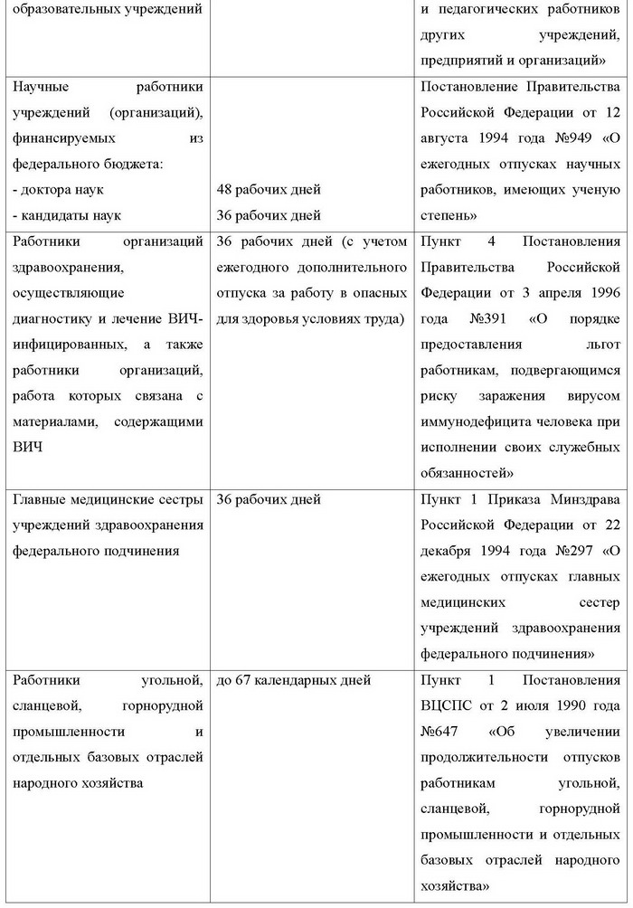 1.2. Продолжительность очередного ежегодного отпуска Продолжительность очередного ежегодного отпуска складывается из продолжительности основного отпуска и дополнительных отпусков. Как уже было сказано выше для расчета общей продолжительности отпуска необходимо суммировать основной и дополнительный отпуска. Очередной ежегодный отпуск предоставляется в календарных днях. При этом если на период отпуска приходится праздничный день, предусмотренный статьей 112 ТК РФ, отпуск продлевается на этот день. Так как праздничные дни в число календарных дней отпуска не включается. Такой порядок предусмотрен статьей 120 ТК РФ. Ситуация: Как рассчитать общую продолжительность ежегодного отпуска, если дополнительный отпуск предоставлен в рабочих днях? В этом случае необходимо воспользоваться методикой расчета, предложенной в письме Минтруда России от 1 февраля 2002 г . № 625-ВВ, для пересчета рабочих дней приходящихся на дополнительный отпуск в календарные дни. Для определения общей продолжительности ежегодного отпуска, необходимо от даты начала отпуска отсчитать количество календарных дней основного оплачиваемого отпуска. Затем от полученной даты отсчитать количество дней дополнительного отпуска по календарю шестидневной рабочей недели. Так определяется дата последнего дня отпуска. Затем необходимо во всем полученном периоде от начала до конца отпуска посчитайте количество календарных дней. Это и будет продолжительность ежегодного отпуска в календарных днях.