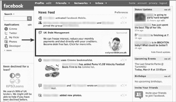 ![]() Рис. 9.5. Рекламодатели в Facebook могут гипертаргетировать свою рекламу на основании восьми параметров, видя при этом, сколько участников Facebook соответствуют заданным критериям