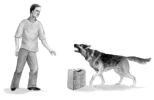 Техника обучения специальным курсам Защитно-караульная служба Поиск вещей человека по запаху требует от собаки умения принюхиваться по команде «Нюхай!», дифференцировать запах человека, находить его вещь среди других и подносить ее дрессировщику. При обучении используются команды «Нюхай!» и «Апорт!». Дрессировщик с помощником выводят собаку на открытое место, лишенное посторонних сильных запахов. Затем помощник раскладывает в один ряд на расстоянии не менее 20 см друг от друга 2-3 предмета, аналогичных апортируемому. Для того, чтобы не «загрязнить» используемые предметы посторонним запахом, раскладывание проводится с помощью пинцета. Дрессировщик сажает собаку рядом с собой, на расстоянии 3 м от предметов, и дает ей нюхать апортировочный предмет. Если собака не сразу начинает обнюхивать предлагаемую вещь, следует обхватить левой ладонью ее морду, чтобы она не могла открыть пасть, а правой поднести к носу животного источник запаха дрессировщика на расстояние 2–4 см от носа. При этом повторяется команда «Нюхай!». После того, как собака занюхала предмет, ее оставляют сидеть, а апортировочный предмет подкладывают к остальным. После этого дрессировщик дает команду «Нюхай!» и указывает на разложенные на земле предметы. ![]() Для защитно-караульной службы используют собак крупных и выносливых пород После того, как собака совершила правильную выборку, ей отдается команда «Апорт!». За выполнение всего упражнения поощряют. Данное упражнение не рекомендуется повторять во время одного занятия больше 3 раз. После того, как собака научится выбирать апортировочную палку, вещи можно разнообразить, используя носовые платки, перчатки, носки и старую обувь. Увеличивают и количество посторонних предметов. При прохождении и этого этапа упражнение усложняется использованием посторонних вещей, имеющих запах разных людей.