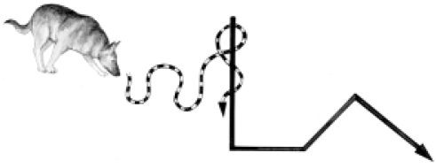 Полностью готовая к поисковой работе по следу собака должна работать со следом протяженностью до 2 км, давностью 2 ч, пересеченным другими следами под различными углами, а также со следом, проходящим через дороги, населенные пункты, водные преграды. Еще одно требование – выборка прокладывающего след помощника из группы в 5-6 человек. Во время отработки навыка поиска по следу и выборки человека из группы по запаху дрессировщику необходимо следить, чтобы в работе не были допущены следующие ошибки: • однотипное прокладывание следа на однообразной местности; • частое сдерживание собаки поводком перед поворотами и оставленными на следу предметами; ![]() Пересечение под прямым углом ![]() Пересечение под острым углом ![]() Усложненное пересечение следов • прокладывание следа в местах с сырой почвой; • маскировка помощника в конце следа в однотипных укрытиях; • наведение дрессировщиком на выбираемого помощника. Сторожевка на местности и в движении имеет целью приучить собаку по команде настораживаться и оповещать о приближении посторонних людей, не подавая голоса. Для отработки навыка используются команды «Слушай!» и «Фас!». Первым этапом является выработка навыка сторожевки на месте. Занятия проводят на полигоне с большим количеством укрытий (кустов, деревьев, оврагов). Лучшим временем считаются поздний вечер и ночь. Перед началом занятий помощник скрывается на полигоне. Дрессировщик выводит собаку на коротком поводке, сажает ее рядом с собой с левой стороны так, чтобы оказаться в 60 м от затаившегося помощника. Место для поста выбирается также в укрытии: в высокой траве, за кустом, деревом, высоким бугром. После того как собака успокоилась, подается условный сигнал помощнику. Одновременно собаке отдается команда «Слушай!».