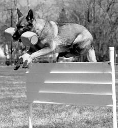 Максимальная оценка – 20 баллов. 3. Посадка из движения Проводник использует команду «Сидеть!». Собака без поводка движется рядом с проводником, идущим в нормальном темпе по прямой. Пройдя 10 м, он должен 1 раз подать команду, продолжая движение и не оборачиваясь. Собаке следует сразу же сесть и остаться неподвижной. Проводник останавливается и поворачивается к собаке, когда пройдет еще 20 м. Вернуться к собаке он может только по разрешению судьи. Проводник должен обежать вокруг собаки и принять исходную стойку. Максимальная оценка – 10 баллов. 4. Укладка и подход Используются команды «Лежать!», «Ко мне!», «Рядом!». Проводник и собака без поводка, находящаяся рядом с ним, движутся нормальным шагом по прямой. Пройдя 10 м, не останавливаясь и не сбавляя темпа движения, проводник 1 раз командует: «Лежать!». Собака должна тут же подчиниться. Остановиться и повернуться к ней проводник может, только пройдя не менее 30 м. Он дает собаке команду «Ко мне!» по указанию судьи, и она сразу же должна подбежать к проводнику быстрым галопом и сесть перед ним. Затем проводник командует «Рядом!», а собака должна сесть слева от него. Максимальная оценка – 15 баллов. 5. Апортировка предмета весом 1 кг на ровной площадке Используются команды «Апорт!», «Дай!», «Рядом!». Проводник бросает по прямой предмет на расстояние около 8 м и командует сидящей рядом без поводка собаке: «Апорт!». Собака должна броситься вперед, принести предмет проводнику кратчайшим путем и сесть перед ним. Подав команду «Дай!», проводник забирает предмет у собаки и командует: «Рядом!». Она должна сразу же сесть слева от проводника. ![]() Апортировка предмета с безопорным прыжком через барьер Максимальная оценка – 15 баллов. 6. Апортировка предмета весом 650 г с безопорным прыжком через препятствие высотой 1 м и шириной 1,5 м. Используются команды «Барьер!», «Апорт!», «Дай!», «Рядом!». Собака сидит у левой ноги проводника, стоящего на подходящем расстоянии от барьера. Он бросает предмет через барьер и подает команды «Барьер!», «Апорт!». Собака должна безопорным прыжком преодолеть препятствие, схватить предмет и, самостоятельно взяв барьер, возвратиться к проводнику и сесть перед ним. Проводник, скомандовав: «Дай!», забирает предмет, подает команду «Рядом!», и собака садится слева от него. Максимальная оценка – 15 баллов. 7. Укладка с выдержкой при наличии отвлекающих раздражителей Проводник использует команду «Лежать!». Собака укладывается по одной команде на указанное судьей место из движения рядом с проводником, который продолжает идти. Он должен не оглядываясь отойти не менее чем на 30 м и, оставаясь на виду у собаки, остановиться спиной к ней. В это же время другая собака начинает такое же упражнение. Максимальная оценка – 15 баллов.