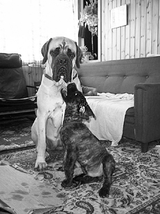 Взрослую собаку очень трудно научить сдерживать свою агрессивность по отношению к другим животным. Щенки в этом вопросе проявляют большую гибкость. Если питомец будет нападать на другое животное, придержите его за шкирку и, говоря с ним ласковым голосом, погладьте. Когда собака успокоится, отпустите ее. Если щенок вынужденно соседствует с морской свинкой, хомячком, птицей, декоративной крысой или кроликом, никогда не оставляйте их наедине. Собака по своей натуре хищник и даже если декоративный грызун будет находиться в клетке, щенок наверняка найдет способ преодолеть это препятствие. Большинство пород достаточно спокойно реагируют на черепах. ![]() ЩЕНОК ЛЕГЧЕ ПЕРЕНЕСЕТ РАЗЛУКУ С ХОЗЯИНОМ, ЕСЛИ У НЕГО ЕСТЬ УДОБНОЕ МЕСТО И ИГРУШКИ Собака обычно не проявляет никакой агрессивности по отношению к этому медлительному существу. Напротив, она может с любопытством обнюхать пресмыкающееся и поиграть с ним: подвигать его лапой или покатать по полу. Собаку и змею нельзя держать в одной квартире. Для пресмыкающегося собака – враг, для большой змеи небольшая собака, особенно щенок, может стать добычей. Собаки в свою очередь испытывают инстинктивный страх перед рептилиями, заставляющий их прятаться от чешуйчатого соседа. Даже если змея маленькая, страх животного не станет меньше, но миниатюрные размеры врага могут привести собаку к мысли, что лучшее средство защиты – нападение. В этом случае трагедии не избежать. Декоративные крысы и мыши могут мирно сосуществовать только с комнатно-декоративными собаками, у которых слабо развит охотничий инстинкт. Эти животные будут спокойно играть друг с другом, однако оставлять их наедине все равно не рекомендуется, так как щенок может забыться и напасть на грызуна. Для кошки собака прежде всего враг. В отсутствие хозяина эти хищники могут устраивать схватки. Если и кошка, и собака отличаются солидными размерами и агрессивным характером, в ходе схватки они могут серьезно ранить друг друга. Конечно, бывает, что собака заводит дружбу с кошкой, но это происходит только когда животные вместе выросли. ![]() ЛУЧШЕ ВСЕГО СОБАКИ УЖИВАЮТСЯ ДРУГ С ДРУГОМ, ОСОБЕННО ЕСЛИ ОНИ ВЫРОСЛИ ВМЕСТЕ Если щенок отличается покладистым характером, он вполне может поладить с маленьким котенком, особенно если до этого у него не было никакого негативного опыта общения с кошками. Собаки плохо уживаются с канарейками и попугаями. В древности собаки охотились на пернатых, и каким бы хорошим ни было воспитание щенка, птиц, содержащихся в неволе, он считает своей законной добычей. Если вы хотите держать нескольких животных, лучше всего заведите 2 или 3 щенков, которые будут вместе играть. |