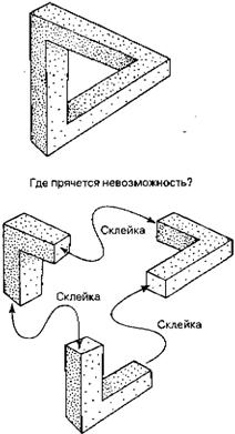 Очень интересные результаты были получены в экспериментах с пассивным осознаванием (которые, кстати, оказались значительно более сложными при осуществлении). Выяснилось, что пассивное осознавание или восприятие чего-либо требует возбуждения мозговой активности длительностью около половины секунды (рис. 3.20, б). В этих экспериментах применялась методика, позволяющая организовать задержку сознательного восприятия раздражения кожи на некоторое время. Очень интересно, что когда эта задержка не превышала половины секунды, испытуемые были уверены, что они воспринимают момент раздражения совершенно точно! Эти результаты выглядят довольно странными, особенно при их сопоставлении. Фактически получается, что «осознание воли» требует 1 секунды, а чувственное восприятие или осознание — около половины секунды. Если вы считаете, что осознание есть нечто, приводящее к какому-то действию, то сталкиваетесь со следующим парадоксом. Вам требуется примерно полсекунды, чтобы осознать некоторое событие. Затем вы должны заставить свое сознание реагировать и вам требуется примерно 1 секунда для принятия свободного решения по возникшей проблеме, т. е. весь процесс принятия осознанного и волевого решения займет около полутора секунд. Мне это представляется совершенно неправдоподобным! Даже с учетом очевидного факта, что большая часть многих разговоров происходит неосознанно и почти автоматически, срок в полторы секунды для осознанного ответа представляется очень длинным и странным! Мне кажется, что в описанных экспериментах есть нечто, что неявно подразумевает и включает в себя основные представления классической физики. Вспомните предложенную выше задачу об испытании бомб, решение которой сначала кажется противоречащим фактам и здравому смыслу. Однако затем выяснилось, что противофазные события могут влиять на ситуацию даже тогда, когда они не происходят на самом деле. Обычная логика в таких случаях оказывается бессильной, если только ее не используют с особой осторожностью. При рассмотрении задач этого типа следует постоянно помнить о необычном поведении квантовых систем и об удивительных возможностях, связанных с квантовой нелокальностью и квантовой «противофактностью». Квантовую нелокальность очень трудно понять в рамках специальной теории относительности. Я твердо убежден, что ее удастся объяснить лишь после перехода к принципиально новой теории, которая не должна сводиться к незначительной модификации уже существующих построений. Новая теория должна отличаться от квантовой механики так же, как общая теория относительности отличается от ньютоновской теории тяготения, т.е. представлять собой концептуально новую систему идей, в которую квантовая нелокальность должна входить естественным образом. В гл. 2 я уже отмечал, что, хотя квантовая нелокальность является весьма необычным и даже загадочным эффектом, она может быть вполне адекватно описана математически. Я поясню свою мысль простой картинкой (рис. 3.21), на которой изображен так называемый «невозможный треугольник». Глядя на эту картинку, вы вправе спросить: «А где, собственно, скрыта невозможность?» Можно ли указать место локализации того, что мы называем невозможностью? Секрет изображения невозможного объекта в данном случае связан с тем, что стоит вам закрыть 