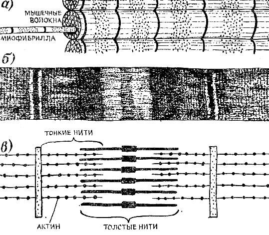 Рис. 9.6 Специалист прав: характер укладка полимерных молекул имеет исключительно важное значение и кардинальным образом влияет на свойства вещества. Хотя полиэтилен, нейлон и другие материалы синтезированы впервые несколько десятков лет назад, изучение их надмолекулярной структуры и исследование приемов, заставляющих молекулы упаковываться разным образом, ведется и сейчас многими исследователями. Мышечное сокращение Мы закончим разговор о больших молекулах рассмотрением одного из примеров, показывающих, как работают макромолекулы в живом организме. Биологи считали своей задачей объяснить соответствие формы живых органов - например, формы руки или листа дерева - функциям" этих органов. Физики, решившие использовать методы исследования строения вещества и законы природы для изучения процессов, протекающих в живых организмах, стремятся понять жизнь на молекулярном уровне. Структура тканей может быть сегодня исследована весьма детально. После установления структуры становится возможным придумать модели биологических событий. Достаточно существенными являются успехи в создании теории мышечного сокращения. Волокно мышцы состоит из двух типов нитей: тонких и толстых (рис. 9.7, а). Толстые нити состоят из белковых молекул, называемых миозином. Физики установили, что молекула миозина имеет форму палочки, заканчивающейся утолщением. В толстой нити молекулы сходятся хвостами в центре (рис. 9.7, в). Тонкие нити состоят из актина, структура которого напоминает две ниточки бус, которые образуют двойную спираль. Сокращение заключается в том, что толстые нити вдвигаются в тонкие.