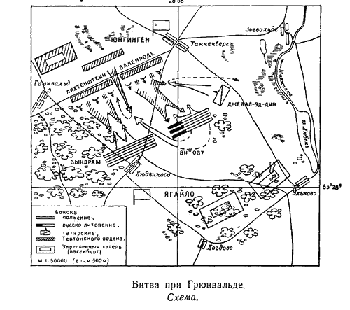 Рано утром 15 июля стояла ясная теплая погода. Польско-литовская армия в походном порядке двигалась по дороге на Гогенштайн. Впереди шли русско-литовские войска, за ними польские. Поднявшийся ветер вскоре нагнал тучи. Пошел частый дождь. Дорога и лесные тропинки размокли, войскам стало тяжело идти, повозки с артиллерией и припасами вязли в грязи. Пройдя около десяти километров, войска остановились и разбили лагерь в лесистой местности между деревнями Логдово и Ульново. Небо опять прояснилось, и засияло солнце. Король Ягайло приказал поставить на холме палатку для богослужения, а сам любовался со склонов холма широко раскинувшимся лагерем союзных войск. На полянах и среди групп деревьев были поставлены повозки двумя четырехугольниками: польские — у Логдово, литовские — около Ульново, на берегу озера Любень. Лошади табунами паслись вокруг лагеря. Кое-где дымились костры — воины сушили одежду, готовили пищу. Между кострами виднелись груды оружия, сложенного поблизости, чтобы в случае тревоги каждый мог взять свое. Солнце жгло немилосердно, и большая часть воинов расположилась в рощах, где в тени вековых деревьев была прохлада. Тотчас после остановки командовавший польской армией старый и опытный военачальник мечник Зындрам из Машковиц выслал разъезды в сторону Танненберга для осмотра местности. Вскоре были получены первые донесения о приближении войск Ордена. По распоряжению Зындрама несколько польских хоругвей оседлали лошадей, изготовились к бою и выдвинулись к Людвиково. Вооружение поляков было хорошим, лошади большого роста, воины хорошо обученные и опытные в ратном деле, не уступающие ни в чем западноевропейским рыцарям. Великий князь Витовт также начал собирать литовско-русские хоругви. Он готовил их к бою и отдавал приказы на случай внезапного нападения противника. Одновременно Витовт зорко всматривался в туманные дали на севере. Было видно, как на возвышенной местности между Грюнвальдом и Танненбергом выстраивались колонны рыцарей. Немцы, сделав ночью в проливной дождь марш не менее двадцати пяти километров, сильно растянулись. Теперь под палящим солнцем они медленно подходили и строились в три боевые линии. На холме у Танненберга развевалось большое квадратное знамя гроссмейстера Тевтонского ордена с широким черно-золотым крестом. В центре креста на золотом щите виднелось изображение прусского одноглавого орла с общипанным хвостом. Над рядами орденских войск колыхались знамена комтуров городов, рыцарских замков и флаги германских княжеств. Среди сверкавших доспехов и шлемов рыцарей там и тут были видны белые плащи орденских братьев с черными крестами на груди. Комтуров можно было узнать по пучкам перьев, развевавшихся на шлемах. Местность, выбранная для сражения, простиралась от Грюнвальдского леса до болот к востоку от Танненберга. Равнина местами вздымалась холмами, местами пересекалась оврагами. Высокая, блестевшая каплями росы, трава изумрудным ковром покрывала все вокруг, кое-где виднелись группы деревьев, потом перелески, и вдали синели громадные вековые леса. В это время в лагере польско-литовских войск король Ягайло закончил богослужение, облачился в доспехи и приказал воинам привязать пучки соломы к шлемам и головным повязкам, чтобы в разгар сражения было легче отличить своих от неприят