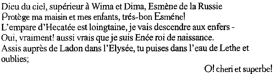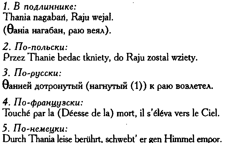 В моем истолковании, которое я представил упомянутой Академии 28 июня 1847 года, я ошибочно отнес древность этой камеи к 5-му или 6-му столетию. Позднейшие сличения с подобными надписями убедили меня, что эта камея гораздо старее, и если она сделана была не до Рождества Христова, то по крайней мере около того времени. Более древняя форма букв А, О и Г дает мне полное право на такое утверждение. По встречающимся в надписи божествам Гелы и Ифуны я должен почислить ее принадлежавшею северным Славянам. Так как надпись заключает в себе несколько выражений, не находящихся в непосредственной связи между собой, то я поместил их на моей таблице в шести отдельных выражениях, означенных буквами а, b, с, d, е и f, и теперь перехожу к истолкованию эмблемы и надписей. Дева моровой язвы, по-русски чума, по-польски Marzanna (маржанна), по-чешски Моrеnа (морена), изображенная нагим скелетом с горящим черепом и бичом в правой костлявой руке, стоит на колеснице, в которую впряжена пара львов, управляя ими левой рукой. Скелет, лежащий вдоль, на пути колесницы, означает ее смертоносный поезд. Скаковой ход чумы останавливает северная богиня жизни и хранительница яблок возрождения «Ифуна», называемая также «Идуною». Что эта третья фигура не скелет, это доказывается не только невидимостью ребер, как общего характеристического признака скелетов, но и находящаяся подле нее надпись «Ифуна» отстраняет всякое в том сомнение. Чума изображена здесь на двухколесной вознице так точно, как Гануш изображает ее в «славянском мифе» стран. 322, и как в литовских преданиях изображают ее с главою, окруженною пламенем (см. Grimm. Р. 1135). Здесь нужно еще заметить для пояснения надписи, что во время чумы все люди держали свои двери назаперти, дабы избегнуть заражения, а когда лютость чумы прекращалась, то жители, возвращаясь в свои оставленные дома, входили в них в окно, а не в двери (см. Grimm's «Deutsche Mythologie» II Aufl. Pag. 1138). Призываемая на этой камее северо-славянская Гела есть строговозвышенная богиня смерти Венедов и Сорбов, к которой как повелительнице подземного мира обращались с мольбой о даровании блаженной кончины и которая, подобно Немезиде и польской Ние, давала умершим примирительное оправдание; а потому ее не должно смешивать с скандинавским ужасным адским чудовищем – Гелом (Hel). Первые две строки сверху составляют начало первой надписи; за ними следует третья, доколе она идет в прямом направлении, включительно до буквы л, а потом на четвертой ее продолжение и заключение; эта надпись изображена отдельно на таблице под литерой а; она составляет рифмованный триолет с однозвучием в первой строке. Первые две строки суть трохеи, а последняя – ямбы. 1. В подлиннике: Ани дверри отверри; Ей тене ехан неби; Нехей ме Хела мти. 2. По-русски: Отнюдь дверей не отворяй; Ея тень съехала с неба; Пусть! меня Гела отмстит. 3. По-польски: 4. По -чешски: 5. По -иллирийски: 6. По-вендски: 7. По-латыни: 8. По-немецки: Если отнимем в третьей строке после первого слова проектированный мной знак восклицания, то смысл этой строки изменится и будет означать: Пускай за меня Гела отомстит; по-польски: Niechaj mie Hela msci. (Moge mich Hela rachen. Hela me ulciscatur). За этим следует краткая приписка, означенная на моей таблице буквой Ь, расположенная позади чумы, отвесно. 1. В подлиннике: Бедами оводеiен. 2. По-русски: Бедами окружена. 3. По -польски: 4. По-чешски: 5. По-иллири