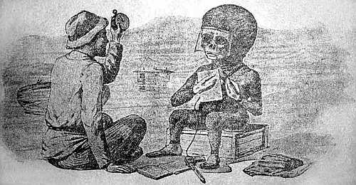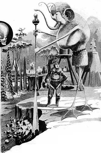 Эта блестящая реконструкция, которая сделала бы честь любому серьезному ученому, нашла поклонников не только среди большевистских вождей, но и среди популяризаторов научного познания. Например, ее принял за основу американский писатель и издатель Хьюго Гернсбек, вошедший в историю литературы прежде всего как создатель первого периодического издания, целиком посвященного фантастике, – журнала «Эмейзинг Сториз» («Amazing Stories»). Кстати, в первых номерах этого журнала были опубликованы многие из произведений Уэллса, ставшие к тому времени классическими. Однако перед тем Гернсбек издавал еще несколько журналов, в которых, помимо фантастики, печатались статьи о научных открытиях того времени. Не остались без внимания и загадочные строители марсианских каналов. В журнале «Электрический экспериментатор» («Electrical Experimenter») Гернсбек опубликовал несколько своих статей, посвященный «научному» реконструированию облика и образа жизни марсиан. Гернсбек придерживался новых взглядов Уэллса на облик марсиан, то есть представлял их именно такими: высокими, покрытыми шерстью существами с тонкими длинными конечностями и с большой безобразной головой, украшенной хоботом и огромными (как у Чебурашки) ушами. Кроме того, на черепе у марсиан имеются забавные антеннки – так, по мнению Гернсбека, должен выглядеть «телепатический орган». Этот образ мы находим не только в серии статей, опубликованных в журнале «Электрический экспериментатор», но и в более поздних работах популяризатора. Среди этих работ нужно отметить статью «Эволюция на Марсе» («Evolution on Mars», 1924), опубликованную в журнале Гернсбека «Наука и выдумка» («Science and Invention»), и специальный номер «Фантастических приключений» («Fantastic Adventure», 1939), посвященный грядущей встрече землян с марсианами Здесь Гернсбек рассуждает о том, как на облик марсиан повлияли особые физические условия, царящие на Марсе. Перед нами – всё тот же великан с хоботом, но к 1939 году хобот заметно сократился и сделался неким особым органом, неизвестным на Земле. ![]() Рис.10.2. Марсиане Уэллса-Гернсбека (иллюстрация к статье «Эволюция на Марсе», 1924 год) «Мы пересекли бездны пространства, – пишет Гернсбек в аннотации к специальному выпуску “Фантастических приключений”, – чтобы встретить человека Марса. При выходе из корабля мы приветствуем тех марсиан, которые приблизились к месту посадки. Какие странные существа. Их эволюция отличалась от нашей ввиду того, что на планете Марс слабая гравитация, разреженная атмосфера и экстремально низкая температура. Марсианин имеет большие уши, чтобы улавливать звуки в разреженном воздухе. Он сообщается с себе подобными при помощи телепатии. Он высок и перемещается на длинных ногах с плоскими ступнями. Его легкие огромны. Его глаза напоминают окуляры телескопов. Его тело покрыто теплым мехом. Его разум наиболее развит среди остальных обитателей Солнечной системы, поэтому марсиане являются обладателями атомного оружия...» Тем не менее, несмотря на очевидную гротескность образа, марсиане Уэллса-Гернсбека вполне человекоподобны. Они – гуманоиды: с двумя руками, двумя ногами, с одной большой головой. Они уродливы, но уродливы в меру, а потому с ними вполне можно сосуществовать и договариваться. От богов – к пришельцам Гипотезу о том, что люди произошли от пришельцев, спустившихся к нам из 
