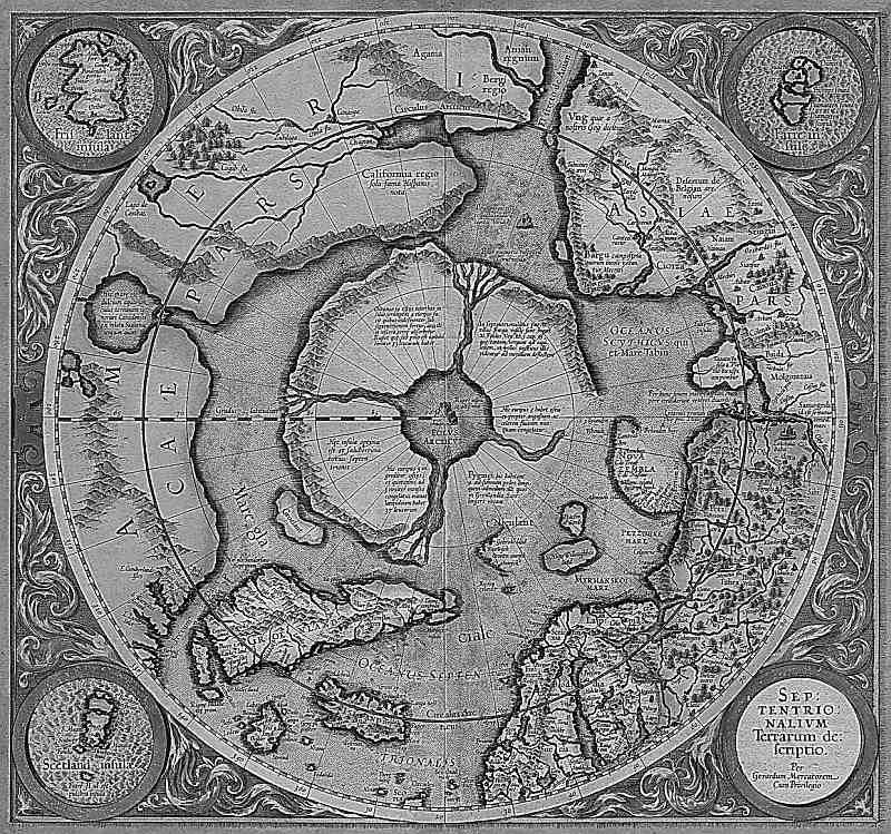 Схожие сведения предоставляет и археология. В V–IV тысячелетиях до н. э. в Степи жили люди так называемой днепро-донецкой археологической культуры. Судя по материалам раскопок, ее создатели занимались охотой и рыбной ловлей, но наряду с этим вполне умело изготавливали керамическую посуду, выращивали культурные растения и выпасали, как уже сказано, крупный и мелкий рогатый скот. А рядом с днепро-донецкой стала развиваться среднестоговская культура, что также «сидела» в степях между Днепром и Доном. Эти люди тоже не дикари были — развитый, судя по захоронениям, религиозный культ, вполне цивилизованные орудия труда. Даже на изготовление игрушек и статуэток не ленились тратить время и усилия. Две культуры на одном месте заставляют уже археологов сделать вывод, что с самого начала в наших степях не было единой, в том числе индоевропейской, общности. А были различные объединения неолитических охотников и скотоводов, к которым индоевропейцы и могли присоединиться. Гиперборея на карте Меркатора. XVI в. Итак, данные совмещаются и рисуют нам вполне логичную картину: часть носителей индоевропейских диалектов, которая сместилась на север через Кавказ и Центральную Азию, встретилась в здешних степях с местным автохтонным охотничьим и скотоводческим населением. В силу определенных причин — прежде всего, видимо, из-за близости сохранявшихся ностратических диалектов с потомственными им индоевропейскими — аборигены восприняли язык то ли завоевателей, то ли ассимилированных беженцев. Сложилась общность, к которой постепенно стали присоединяться пришельцы из разных мест. Но такие присоединения закономерным образом создавали и неоднородности. А потому от этой неоднородности, от этого «плавильного котла» некие общности регулярно же отделялись. И уходили — кто на запад, кто на восток, кто на юг. Куда и разносили рассказы о стране, где хорошо. И дали начало мифу о блаженной Гиперборее.
