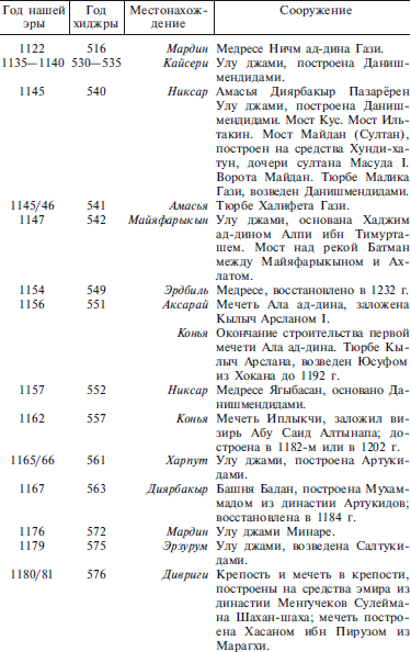 Приложение III Здания с глазурованными изразцами Акшехир. Кюмбет Сеита Махмута Хайрани, 1237 г. Амасья. Тюрбе в джами Бурмалы, 1237–1247 гг. Анкара. Алтарь в мечети Арслан-хана, лепнина и изразцы – прекрасный пример стиля барокко, 1289 г. Бейшехир. Джами Ашрафоглу, 1296 год. Хранившиеся здесь найденные на развалинах дворца султана фрагменты изразцовой облицовки в настоящее время экспонируются в музее Каратай в Конье. Бирге. Улу джами, 1312 г. Кайсери. Алтарь джами Гюлюк, 1210 г. Конья. Мавзолей Кылыч Арслана II. Алтарь мечети Ала ад-дина. Медресе Сырчалы, 1242/43 г. Медресе Бююк Каратай, 1251. Мечеть Сахиб Аты (или Ларенде), 1258/59 г. Портал медресе Индже Минаре, 1271 г. Изразцы из кешка в Конье выставлены в музее Каратай, Конья. Малатья. Улу джами, 1237 г. Сивас. Мавзолей султанов в больнице Дарушшифа, 1217 г. Медресе Гёк, 1271 г. Соке. Мечеть Ментешоглу Сулейман-бей, 1299 г. Токат. Медресе Гёк, 1270 г. Чай. Медресе, 1258 г. Эрзурум. Медресе Чифте Минаре, 1253 г. Примерная хронологическая таблица сельджукских построек в Малой Азии ![]() ![]() ![]() ![]() ![]() ![]() ![]() ![]() ![]() ![]() ![]() Караван-сараи, мосты, усадьбы-кешки, термальные бани и источники ![]() ![]() Мосты г. Диярбакыр, базальтовый мост, 1063. Мост на дороге Ахлат – Майяфарыкын, 1147/48. Мост над р. Кызыл-Ырмак на дороге Кайсери – Кыршехир, около 1200. Мост в г. Токате, 1250. Кешки Кешк без названия на дороге Йозгат – Кайсери, 1241. Кешк Хайдар-бея, г. Кайсери, 1251. Термальные бани и источники Сохранились упоминания о более чем 200 термальных банях, местонахождение 130 из них удалось установить. Самыми популярными были: Хавза. Там функционировали два комплекса бань; больший был построен Масудом I в 1116 г. и был известен под двумя названиями – «Бани султана Масуда» и «Бани Сазы-паши»; построенный примерно в то же время меньший назывался «Бани Ёнгюч Заде Мустафы». Кыршехир. В трех часах езды от города находились бани Каракунда; они были сооружены в 1135 г. Али Каракундом. Его мавзолей стоял рядом с ними. Ильгын. Вулканические источники, которым город обязан своим названием, расположены в двух часах езды от него. Первые бани были построены в том месте в 1236 г. султаном Ала ад-дином Кейкубадом I в благодарность за снятие у него острого приступа подагры; в 1267 г. визирь Сахиб Ата их перестроил и перепланировал. Сохранившаяся надпись гласит, что построил их Калоян, однако, вероятно, она относится к первому варианту сооружения. Хамидийе. Бани находятся в трех с половиной часах езды от города в местечке, расположенном поблизости от дороги в Конью. Йонджал. Бани находятся в 14,5 километра от Кютахьи на дороге Кютахья – Турсалы. Согласно обнаруженной надписи, они были построены в 1233 г. Гюльсун или Гюсум, дочерью архитектора Рамазана. Архитекторы и мастера-каменщики Абу Бакр из… и Ахмет Бизл – без сомнения, то же самое, что и Никсар, Кюмбет Кырк Кызлар, 1220. Ахмет Бакр и Ахмет ибн Бизл из Маранды. Сивас, Медресе Шифайе, 1217. Абу Бакр и его сын Яку б, оба из Малатьи. Малатья, купол улу джами, 1247. Абу Али ибн Али-Ракка ал Каттани из Алеппо. Синоп, оборонительные сооружения, 1216. Амасья, тюрбе эмира Мухариз Алдына, 1224. Алайе, оборонительные сооружения и Кызыл Куле, 1224–1228. Ахмет ибн Ибрахим из Тифлиса и Курам-шах из Ахлата, сын Мухида из Ахлата. Дивриги, улу джами и больница для душевнобольных, 1228. Ахмет ибн Абдулла из Мосула. Акшехир, тюрбе Сейита Махмута Хайрани, 1237. Али ибн Хусейн Эмирдад, который, как считал К. Хуа