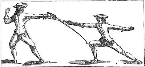 На смену рапире как предмету искусства, которое преподавали в конце XVII века с разрешения Academies du Roy, пришла шпага. Перемены в стиле фехтования соответствовали переменам формы оружия. Как только в фехтовании отказались от любых рубящих ударов, повсеместно были приняты легкие трехгранные клинки с долом[147]. Однако фехтование на рапирах (в основном острием, но удары не были исключены) еще долгое время продолжало существовать в Испании, Италии и некоторых немецких школах. Избавившись, таким образом, от большинства обычаев, связанных с рапирой, французская школа заняла лидирующее положение в искусстве владения оружием, которому суждено было завоевать всю Европу. Давние традиции академии, заведения уникального в своем роде, по меньшей мере в XVII и XVIII веках, неизбежно благоприятствовали развитию совершенной системы. Вполне естественно, что долгая последовательность сменявших друг друга мастеров, из которых каждый с самого начала профессионального пути вдохновлялся разумными принципами, была причиной непрерывного прогресса. Этот прогресс в умении элегантно отправить на тот свет своего ближнего состоял скорее не в изобретении новых способов атаки и защиты, а в четком определении правил и специальных движений и в отказе от несовершенных, неопределенных действий. Хорошие мастера скорее стремились к тому, чтобы успех зависел от правильности и точности, чем от разнообразия приемов или простой подвижности. Французская школа до сих пор придерживается этих принципов. Однако устаревшие понятия, например использование левой руки для защиты, отвечавшие естественной склонности человека контратаковать и парировать одновременно, или, как казалось, преимущества, которые давали вольты, наклоны корпуса и переходы по диагонали молодым и проворным, слишком глубоко укоренились в умах фехтовальщиков, чтобы их так просто было забыть. ![]()