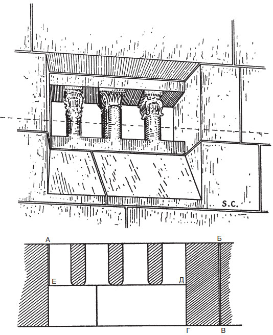 Глава 15 Окна и вентиляционные отверстия В Египте, с его обилием света, окна играли весьма незначительную роль в архитектуре вплоть до эпохи Нового царства, когда стали очень популярны стены с верхним рядом окон и стены-перегородки. Для того чтобы пропускать в помещение свет, служили двери. ![]() Рис. 101. Сечения световых отверстий между стенами и плитами крыши в храме Тутмеса III в Мединет-Абу Примитивная форма окна, которую использовали на протяжении всей истории египетской архитектуры в храмах, представляет собой узкую щель, находящуюся в месте соединения крыши и стены. Эти щели располагались так высоко, что через них ничего нельзя было увидеть, и к тому же были слишком узки, чтобы с крыши можно было заглянуть внутрь. Самые древние окна такого типа имеет долинный храм Второй пирамиды в Гизе (Храм Сфинкса). Окна-щели делались такими, как было удобно строителям, – одни вырубались в стене, другие – в плитах крыши, а третьи – и тут, и там. Окна обычно делали по бокам храма, но иногда они выходили на крышу (рис. 101–105). В семи расположенных в ряд святилищах храма Сети I в Абидосе они прорублены в изгибе ложной арки (рис. 117). Такая форма светового отверстия очень редко имела украшения. Однако в Дендере на наклонных поверхностях многих окон-щелей вырезаны солнечные лучи, проходящие сквозь них. ![]() Рис. 102. Световое отверстие в плите крыши храма Тутмеса III в Мединет-Абу В большинстве храмов, где уцелели плоские каменные крыши или их фрагменты, можно увидеть небольшие отверстия, через которые в помещение проникали свет и воздух. Египтяне прилагали много усилий, чтобы эти отверстия не ослабили крышу – мы видим, что они проделаны в месте стыковки двух плит. ![]() Рис. 103. Сечение светового отверстия в Дейр-эль-Медине. Эпоха Птолемеев ![]() ![]() Рис. 104, 105. Поперечные разрезы в храме Опет в Карнаке. Эпоха Птолемеев Хорошо известны необычные вентиляционные шахты Великой пирамиды, и мы не будем останавливаться на них подробно. Достаточно отметить, что по ним воздух поступал в камеру царя и камеру царицы. Вначале эти шахты идут горизонтально, но потом они резко поворачивают вверх под углом около 30° и через 64 м выходят на поверхность. Поперечное сечение этих шахт квадратное, сама шахта высекалась из одного камня, а другой камень образовывал ее крышу. Эти шахты проложены не через блоки, лежащие горизонтально, а блоки, в которых они высечены, располагаются под тем же самым углом, что и линия вентиляционных шахт, точно так же как и большие проходы в пирамиде. В тех местах, где шахты были перерезаны, когда проделывали проход, можно изучить их устройство. ![]() Рис. 106. Вентиляционное отверстие межу двумя плитами крыши. Храм Сети I в Абидосе Верхний ряд окон появился только в эпоху Нового царства. Остатки великолепного примера таких окон этого периода сохранились в гипостильном зале в Карнаке (рис. 107). Их можно увидеть и в храме Сети I, в Рамес-сеуме в Фивах и храме Хонсу в Карнаке. Позже они почти полностью исчезли, уступив место стенам-перегородкам, которые сооружали между колоннами. Такие колонны устанавливались в первом гипостильном зале многих храмов (фото 50). В любом случае в храмах эпохи Птолемеев и римского периода, таких как Эдфу и Дендера, верхнего ряда окон мы не находим. Стены-перегородки, насколько нам известно по дошедшим до нас памятникам, предшествовали верхнему ря