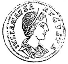 Юлия Меса (около 160 года — 226 год) После убийства Каракаллы и смерти Юлии Домны императором стал Опилий Макрин. Уроженец далекой Мавритании, он получил трон только потому, что Рим устал от безумств Каракаллы и был безразличен в тот момент к вопросам власти. Сенаторы в один голос говорили: «Кого угодно, только не кровосмесителя. Кого угодно, только не грязного человека. Кого угодно, только не убийцу сената и народа». Так отражает общественное мнение Юлий Капитолии. Ненавидимый всеми (и гражданами, и воинами), Макрин был вынужден действовать крайне осторожно. Именно поэтому он не посмел казнить сестру Юлии Домны — Юлию Месу, которая долгие годы жила вместе с императорской семьей. Ей было предложено покинуть дворец и отправиться на родину — в Сирию. Юлии Месе даже оставили огромное состояние, которое было накоплено при царственных родственниках. Юлия Месса (Изображение на монете) Если бы только Макрин мог представить, что главная его опасность таится не в гордых римских сенаторах, презрительно относившихся к нему, незнатному мавританцу; не в войсках, привыкших в последнее время поднимать бунты и за деньги выдвигать собственных императоров; не в наемных убийцах, которых он сам использовал, чтобы убрать предыдущего властителя, — а в этой невзрачной старушке. Именно от нее будет зависеть дальнейший ход римской истории, и следующими императорами станут те, которых пожелает эта женщина. У Юлии Месы было две дочери — Соэмия и Мамея, у каждой из которых имелось по сыну — это Бассиан и Алексиан (Александр). Дадим возможность Геродиану рассказать нам об этих детях и о том, что с ними связано. «Они воспитывались при матерях и при бабушке; Бассиан достиг приблизительно четырнадцати лет, а Алексиану пошел десятый год. Они были посвящены богу Солнца; ведь местные жители поклоняются ему, на финикийском языке называя его Элагабалом. Воздвигнут ему громадный храм, украшенный большим количеством золота, серебра и роскошными драгоценными камнями. Он почитается не только местными жителями, но и все соседние варварские сатрапы и цари каждый год щедро посылают богу роскошные посвящения». Таким образом, в руках Бассиана и его бабки Юлии Месы находились огромные денежные средства. «Бассиан, являвшийся жрецом этого бога (ему, как старшему, был вверен культ), выступал, одетый по-варварски, препоясав златотканые хитоны, пурпурные, с рукавами и спускающиеся до пят, покрыв обе ноги от ногтей до бедер одеждами, также разукрашенными золотом и пурпуром; голову украшал венок, расцвеченный блеском роскошных драгоценных камней. Был он в цветущем возрасте и красивейшим из всех юношей своего времени. Вследствие того, что в нем соединялись телесная красота, цветущий возраст, пышные одежды, можно было сравнить юношу с прекрасными изображениями Диониса». По соседству с Эмесой, где и находился храм бога Солнца, располагался лагерь 3-го Галльского легиона. Солдаты часто посещали нитый храм и восхищались юным жрецом. Многие из легионеров были клиентами Месы и находились под ее покровительством. Им она и сказала «правду» о том, что ее внук в действительности — сын императора Антонина Каракаллы. Прозвучала эта версия весьма правдоподобно по той причине, что неразборчивый в любовных связях Каракалла «часто посещал ее дочерей, которые были юными и прекрасными, в то время, 