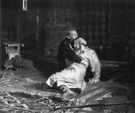 Иван Грозный, не убивающий своего сына 16 января 1913 года в залах Третьяковской галереи, как всегда, было многолюдно. Однако у огромного полотна великого живописца Ильи Ефимовича Репина «Иван Грозный и сын его Иван 16 ноября 1581 года», давно уже прозванного москвичами «Иван Грозный убивает своего сына», народ не толпился. Нет, зрители, конечно, подходили к великой картине, но, взглянув с любопытством, вмиг переходящим в испуг, спешили отойти подальше. Уж слишком натурально и трагично изобразил художник одну из самых кровавых страниц русской истории. Недаром же друг Репина, не менее великий российский живописец И.Н. Крамской, написал, едва увидев картину: «Вот она, вещь в уровень таланту… И как написано, боже, как написано!.. Что такое убийство, совершенное зверем и психопатом?.. Отец ударил своего сына жезлом в висок! Минута… В ужасе закричал, схватил его, присел на пол, приподнял его, зажал одной рукою рану на виске (кровь так и хлещет между щелей пальцев), а сам орет… Это зверь, воющий от ужаса…» Ясно же, что у такой картины зрители не сильно задерживались – смотреть ее нужно было, имея стальные нервы. И. Репин. Иван Грозный убивает своего сына. 1885Да только 16 января 1913 года у полотна со сценой убийства почти на четверть часа застыл невзрачный посетитель лет двадцати пяти. Был он небольшого росточку, теребил прядки своих жиденьких волос, смотрел горящими глазищами и вдруг… кинулся к полотну, закричав: «Довольно крови!» В руках безумца сверкнул нож. Первый удар этого ножа рассек лицо Ивана Грозного, второй – его сына, третий – руки отца и царевича. Удары были такой силы, что не только рассекли холст, но и пробили подрамник, даже толстенную раму раскололи. Надо отметить, что вандал сбежать не пытался, только всхлипывал, когда смотрители галереи с пришедшими им на помощь посетителями скручивали ему руки. Несколько человек даже признали его – это был сын известного московского мебельного фабриканта Балашова – Абрам. Изувеченную картину увезли на реставрацию (прошедшую вполне удачно), преступника – сначала в участок, потом – в лечебницу для душевнобольных, где он и окончил свои дни. Только вот москвичи еще долго шептались, что полотно Репина обладает «нехорошим духом» и «черным отсветом». Но ведь и что взять с картины, изображающей такую жуткую сцену: отец в припадке безумия убивает собственного сына-наследника?! История эта известна всем. Не только в России, но и во всех странах мира знают, что жестокий русский царь Иван Грозный, вспылив, убил сына, царевича Ивана, ударом посоха. Известно и за что: жена царевича поперечила в чем-то Грозному, и тот начал пинать кулаком в живот бедную женщину. А та была на сносях, вот царевич и вступился за молодую жену. Ну тут Грозный и размахнулся на сына. Ну и убил… Зверь… Ирод… Правда, наш великий историограф Н. Карамзин написал несколько иное. Он считал, что царевич попросил дать ему войска, чтобы освободить Псков, но Грозный, видящий во всем одну измену, решил, что сын хочет собрать войска против него: «Иоанн в волнении гнева закричал: «Мятежник! Ты вместе с боярами хочешь свергнуть меня с престола!» – и поднял руку. Борис Годунов хотел удержать ее, царь дал ему несколько ран острым жезлом своим и сильно ударил им царевича в голову. Сей несчастный упал, обливаясь кровью!» Впрочем, какие бы версии ни выдвигались – 