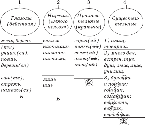 Все остальные слова (сколько бы их ни было) пишутся так же. Один в один. Чувак в ушанке за это отвечает. Запоминать эти слова не надо. Образец – «в течение». Все слова из первой позиции – «родные братья». Поэтому они все пишутся одинаково. Двоюродный: слово «вследствие». «Е» в конце, как у всех братьев: правое ухо у него есть. А левого нет! «Вследствие» – слитно. Друган – это другой: не брательник, но друган. Это Кенни: у него вообще нет никаких ушей, он же весь замотан в капюшон. Слово «впоследствии» – другое, те были предлоги, а это – наречие. Но это неважно. Итак, делим все слова на 3 группы: ![]() Вывод: 1) последнее слово (впоследствии) здесь лишнее. У Кенни и ушей не видно, да и его опять убили. Позицию 3 снимаем с контроля! В остатке: только слово «вследствие» отличается от всех остальных. У него одна позиция «е» в конце (одно ухо), а у всех остальных – «родных братьев» – две! (2 уха): «в» – раздельно, «е» – в конце. Попроси своих родных (или кого-то, кроме них) читать эти слова, а ты будешь их писать! Следи обе позиции (начало слова – «в» и конец «е»). Ставь цифры: номера позиций. Ты никогда больше не ошибешься в написании этих слов! Учился в течение каникул, беседа длилась в продолжение часа, Москва в отличие от Питера, в заключение приведу еще один важный факт, в завершение своего сочинения я сделаю одно предположение, мой брат еще и двойку по физкультуре получил в довершение ко всему, я сегодня опоздал вследствие пробки, впоследствии поступил в институт и учился там в течение полсеместра, пока не выгнали вследствие неправильного поведения, я в отличие от всех вел себя нормально, в заключение скажу, что все идет по плану, в завершение своего сочинения я хочу привести цитату из произведения Н. В. Гоголя. Глава 9 «Ь» после шипящих в конце слов (все позиции) Один из самых легких и простых алгоритмов, не требующих особой проработки. Усваивается сразу, закрепляется в две задачи, при этом он решает проблему довольно радикально и неожиданно. Вначале вопрос к тебе: отвечать быстро, долго не думать (самый правильный ответ – это простой и быстрый ответ). Быстро назови любых 2–3 слова с мягки знаком после шипящих на конце! После этого ты можешь подглядеть внизу следующей страницы, какие слова всем приходят в голову, и сверить со своими. Скорее всего – нечто подобное вспомнил и ты. Это не случайно – к этому мы еще вернемся. Проверь себя: Муж…, объелся груш…, чай горяч…, отреж…те булоч… ку, улич…ный скрипач…, гаеч…ный ключ…, шел мимо дач…, вышли из училищ…, много встреч…, туч…, остров сокровищ…, овощ… колюч… и свеж…, рассеч… бровь, пересеч… улицу, волосы до плеч…, контролер злющ… и бесстыж…, у него на носу прыщ…, родная реч…, реч…ной вокзал, ты гонщ…ик и обманщ…ик, надо отвлеч… учителя, до новых встреч…, застен…чивая жен…щина, упал навзнич…, двери настеж…, намаж…ся не отмоеш…ся, не еш…те мухоморы, в чем престиж…. Рабочий алгоритм: «ь» после шипящих (все позиции) см. в таблице на следующей странице. Комментарии к позициям: 1. В глаголах формально – 3 позиции: – начальная форма: «жечь», «беречь» ![]() – второе лицо: ты учишь(ся), паришься. «Хвосты» – в сторону! – «просьба»: не ешьте, намажься (специально даются примеры с «хвостами», чтобы их отбросить!). Вывод: что за позиция – неважно. В «действиях» (глаголах) мягкий знак есть всегда! (невзирая на «хвосты»). 2. В наречия