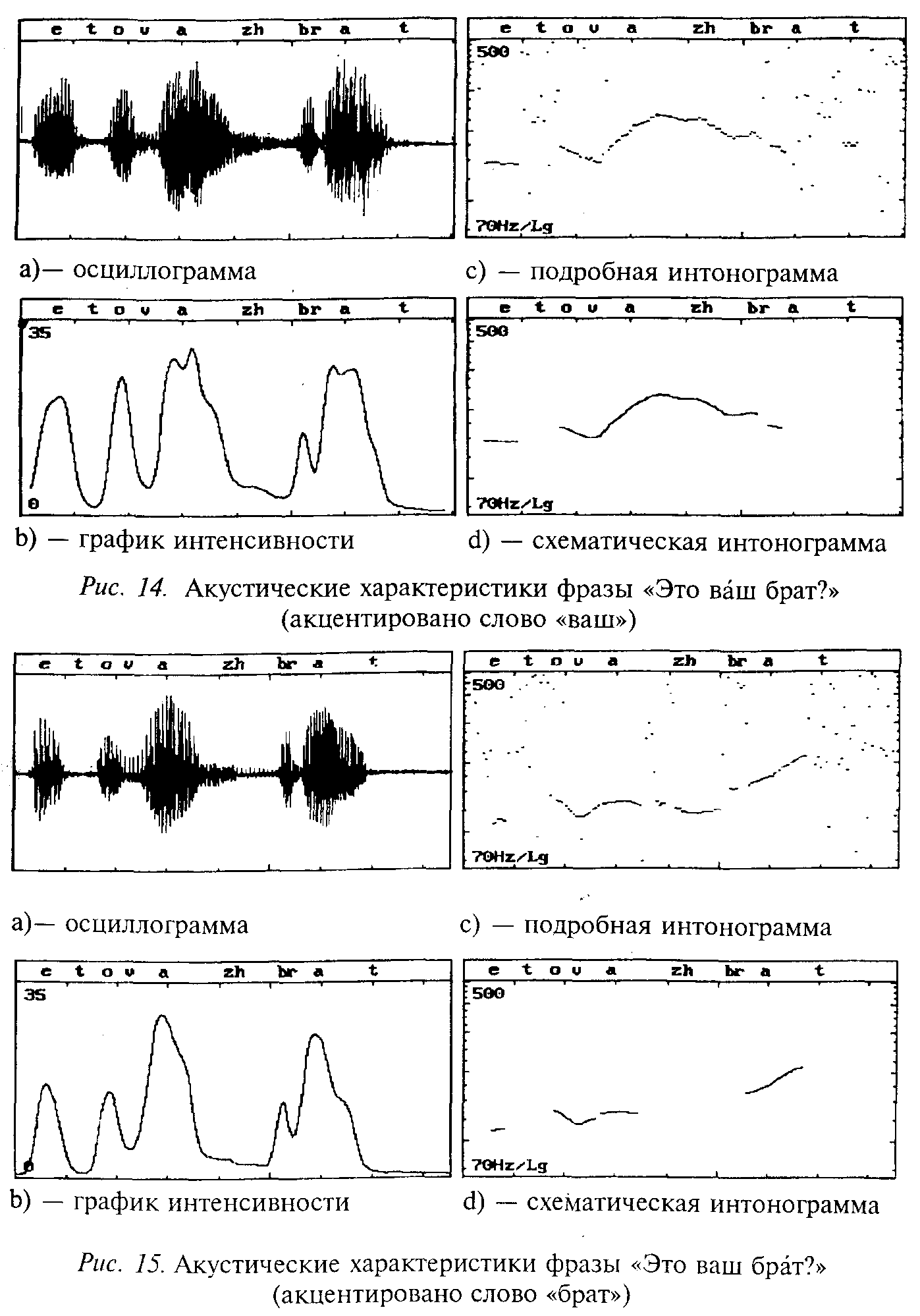 Как видно из таблицы, ударный слог в полтора раза сильнее и длительнее первого предударного и в три раза сильнее и длительнее прочих безударных слогов. А, например, в английском языке (где то же динамическое ударение и сильная редукция) наиболее слабыми и короткими будут 1–й предударный и 1–й заударный слоги; слоги же, отстоящие от ударения на два слога, несколько сильнее и длительнее первых, т. е. схема может быть представлена так: