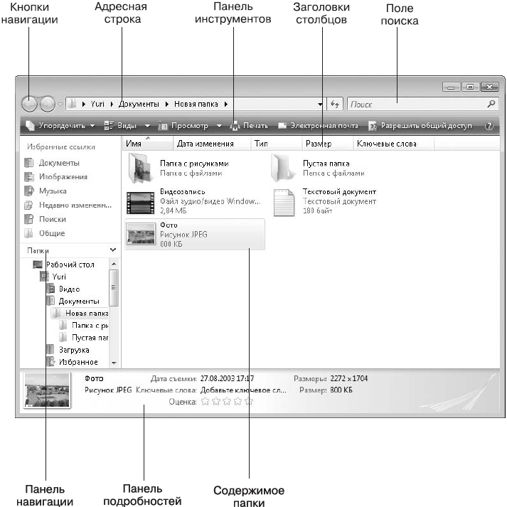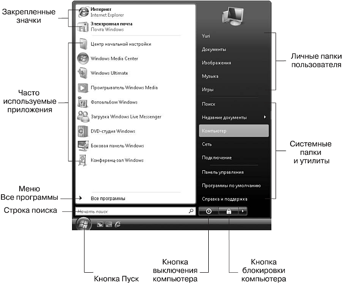 Глава 2 Работа в среде Windows Vista ? Урок 2.1. Меню Пуск и Панель задач ? Урок 2.2. Рабочий стол ? Урок 2.3. Настройка интерфейса Windows Vista ? Урок 2.4. Окна папок ? Урок 2.5. Упорядочивание и поиск файлов ? Урок 2.6. Операции с файлами и папками ? Урок 2.7. Работа с изображениями в Windows ? Урок 2.8. Работа со сменными носителями В этой главе рассмотрены особенности выполнения в Windows Vista различных повседневных действий: работа с меню Пуск и Панелью задач, выполнение операций с файлами и папками, поиск файлов и работа со сменными носителями. Для успешного усвоения материала вам понадобятся знания и умения, приобретенные при изучении первой главы. Урок 2.1. Меню Пуск и Панель задач Основные элементы меню Пуск Для запуска программы, открытия документа или начала работы в Интернете проще всего использовать меню Пуск. Здесь вы сможете легко найти нужный вам объект с помощью строки поиска, выбрать одну из часто используемых программ, а также открыть личную или системную папку. После установки и настройки Windows Vista меню Пуск будет иметь вид, показанный на рис. 2.1. ![]() Рис. 2.1. Меню Пуск Меню Пуск состоит из двух колонок: в левой находится строка поиска и ярлыки часто используемых программ, а в правой – ссылки для открытия личных папок пользователя, системных объектов и утилит. Имя пользователя, который вошел в систему, и его значок находятся в верхней части правой колонки. После щелчка кнопкой мыши на значке появляется окно Учетные записи пользователей, а щелчок кнопкой мыши на имени пользователя открывает папку его профиля. Во время работы пользователя система подсчитывает частоту запуска различных приложений и помещает в левую колонку меню Пуск программы с самым высоким «рейтингом» использования. Попробуйте несколько раз подряд запустить определенное приложение из меню Все программы – и его значок появится в меню Пуск вместо одного из ранее имевшихся. Программы с более высокой частотой использования будут постепенно перемещаться в верхнюю часть списка. Верхняя часть левой колонки меню Пуск называется закрепленной. Помещенные в нее значки будут присутствовать всегда, независимо от частоты их использования. По умолчанию в закрепленной области находятся команды запуска программ Internet Explorer и Почта Windows, но вы можете добавлять туда свои значки и удалять существующие. Во всех предыдущих версиях Windows для запуска приложений использовалось многоуровневое меню Программы или Все программы. Это меню присутствует и в Windows Vista, но принцип его работы несколько изменен. Теперь вся навигация выполнятся в пределах левой колонки меню, а для выбора нужной программы можно использовать колесо прокрутки. В нижней части меню Пуск находятся две кнопки. ![]() Выключение. В зависимости от системных настроек данная кнопка может либо переводить компьютер в режим пониженного энергопотребления (режим сна), либо выполнять завершение работы Windows с последующим выключением компьютера. ![]() Блокировка. Эта кнопка служит для перехода к экрану блокировки компьютера, а стрелка > рядом с ней открывает меню, в котором перечислены все доступные варианты завершения работы: Смена пользователя, Выход из системы, Блокировка, Перезагрузка, Сон и Завершение работы (см. урок 1.2). Элементы в правой колонке меню Пуск представлены только в виде текста, а соответствующее изображение будет появляться в верхней част