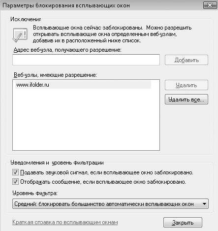 Подведение итогов Вопросы для самопроверки ? Назовите основные части окна программы Почта Windows. ? Каково назначение папок Входящие, Исходящие, Отправленные, Удаленные и Нежелательная Почта? ? В каких случаях используется команда Доставить почту? ? Как создать и отправить электронное письмо? ? Как переслать файл по электронной почте? ? Что такое спам и как от него защититься? ? В чем заключается опасность открытия вложенных файлов от неизвестного отправителя? ? Для чего используется папка Контакты? Что дальше? Заключительный урок этой главы будет посвящен вопросам безопасности при работе в Интернете. Вы узнаете о том, какие опасности подстерегают вас в процессе работы в Сети и как от них защититься. Урок 3.6. Безопасность при работе в Интернете Работая в Интернете, вы подвергаете свой компьютер риску быть атакованным хакерами, а при посещении сайтов и получении электронной почты вы можете «подхватить» вирус или шпионскую программу. В обозревателе Internet Explorer применяется целый комплекс мер безопасности, основные из них будут рассмотрены в этом уроке, а другие аспекты безопасности системы будут рассмотрены в уроках 4.2 и 8.2. Блокирование всплывающих окон Internet Explorer умеет блокировать всплывающие окна, которые используются некоторыми веб-узлами для показа навязчивой рекламы. Если вы откроете сайт, содержащий всплывающие окна, то они будут заблокированы, а в верхней части окна Internet Explorer появится панель с информацией о блокировке всплывающих окон. Если вам нужно просмотреть заблокированные всплывающие окна, щелкните кнопкой мыши на панели информации и выберите одну из двух команд: Временно разрешить всплывающие окна или Всегда разрешать всплывающие окна от этого узла (рис. 3.27). При выборе последней команды узел будет добавлен в список разрешенных. Вы можете полностью отключить блокировку всплывающих окон, выполнив в окне Internet Explorer команду Сервис > Блокирование всплывающих окон > Выключить блокирование всплывающих окон. Повторное выполнение этой команды приведет к возобновлению режима блокирования. Для настройки параметров блокирования выполните команду Сервис > Блокирование всплывающих окон > Параметры блокирования всплывающих окон. В появившемся окне (рис. 3.28) вы можете изменить список разрешенных веб-узлов, отключить звуковой сигнал или панель информации при блокировке окон, а также установить один из имеющихся уровней фильтрации. ![]() Рис. 3.27. Блокирование всплывающих окон в Internet Explorer ![]() Рис. 3.28. Параметры блокирования всплывающих окон Блокирование активного содержимого Веб-страницы могут содержать не только тексты и рисунки, но и специальные программные модули, расширяющие возможности веб-страниц и позволяющие сделать их интерактивными. Однако в то же время этими средствами могут воспользоваться злоумышленники для получения доступа к вашему компьютеру. На некоторых сайтах загрузка активных элементов происходит автоматически, и в целях безопасности Internet Explorer блокирует этот процесс, сообщая об этом пользователю на информационной панели. Щелкнув кнопкой мыши на таком сообщении, вы получите список доступных действий для заблокированных объектов, среди которых будет команда, разрешающая загрузку активных элементов. Перед установкой загружаемых элементов вам может понадобиться подтвердить действия в окне UAC. Кроме тог