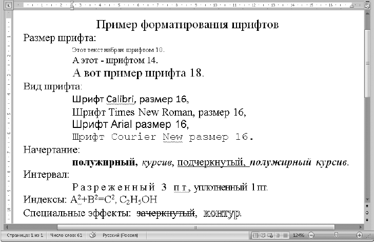Практическая работа 30. Редактирование документа. Работа с фрагментами. Задание. Отредактировать сохраненный документ. Последовательность выполнения 1. Откройте ранее сохраненный документ Урок 1 любым способом. 2. Выделите слово, предложение, строку, абзац, весь документ. Для снятия выделения щелкните кнопкой мыши на любом месте документа. 3. Удерживая нажатой клавишу Ctrl, выделите мышью несколько несмежных областей документа. 4. Измените размер шрифта выделенного фрагмента. 5. Отмените изменение шрифта, нажав кнопку Отменить на панели быстрого доступа. 6. Выделите последний абзац и перетащите его с помощью мыши в начало документа. 7. Выделите любое слово и перетащите его мышью в другое место предложения. 8. Выделите первый абзац и перетащите его в конец документа при нажатой клавише Ctrl, таким образом скопировав его. 9. Несколько раз нажав кнопку Отменить, верните документ к первоначальному виду. 10. Внесите ошибки в некоторые слова и исправьте их с помощью средства проверки правописания. 11. С помощью команды Office > Сохранить как сохраните документ под новым именем Урок 2 и закройте программу Word. Подведение итогов Вопросы для самопроверки ? Каким способом лучше всего открыть недавно сохраненный документ? ? Как в Word можно выделить слово, строку, предложение, абзац? ? Какая разница между буферами обмена Windows и Microsoft Office? ? Всегда ли в слове, подчеркнутом красной линией, допущена ошибка? ? Какие вы знаете средства автоматизации ввода и редактирования текста? Что дальше? В следующем уроке вы научитесь форматировать текст: изменять внешний вид шрифтов, настраивать выравнивание абзацев и их положение на странице, использовать списки, табуляцию и другие средства. Урок 5.3. Основы форматирования текста С помощью средств форматирования вы сможете придать документу привлекательный вид, изменяя параметры отображения символов, абзацев и целых страниц. Word обладает богатым набором инструментов для форматирования, причем один и тот же результат может быть получен различными способами. Использование шрифтов О том, как изменить размер шрифта, вы уже узнали из урока 5.1, но кроме размера можно изменять и многие другие параметры шрифтов. Команды для изменения формата шрифтов находятся в группе Шрифт вкладки Главная. На рис. 5.25 приведен фрагмент документа с использованием различных параметров шрифтов. ![]() Рис. 5.25. Примеры использования различных параметров шрифтов Рассмотрим назначение кнопок в группе Шрифт более подробно. ![]() Шрифт. Из раскрывающегося списка вы можете выбрать один из установленных в системе шрифтов. Шрифты отличаются друг от друга формой букв, наличием засечек и другими особенностями. В процессе выбора шрифта для выделенного фрагмента вы сможете сразу же видеть вид фрагмента с использованием нового шрифта. ![]() Размер шрифта. Вы можете выбрать размер шрифта из раскрывающегося списка или ввести значение размера вручную, после чего нажать клавишу Enter. Вы также можете использовать кнопки Увеличить размер ![]() и Уменьшить размер ![]() К любому фрагменту текста можно применить один из вариантов начертания с помощью следующих кнопок: ![]() Полужирный; ![]() Курсив; ![]() Подчеркнутый; ![]() Зачеркнутый; ![]() Подстрочный знак (Нижний индекс); ![]() Надстрочный знак (Верхний индекс). Указанные кнопки действуют как переключатели: первое нажатие включает эффект, 