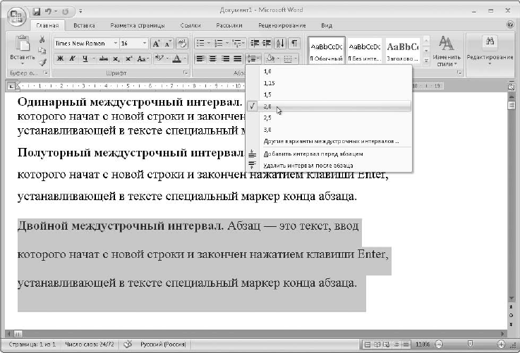 ![]() Рис. 5.29. Диалоговое окно Шрифт, вкладка Интервал При изменении параметров шрифтов учитывайте следующие особенности. ? При наличии выделенного фрагмента изменение параметров применится только к нему. ? Если фрагмент не выделен, новые параметры будут применены начиная с текущей позиции курсора, при этом формат ранее введенного текста изменен не будет. ? Если курсор находится в середине слова, новые параметры будут применены ко всем словам. Практическая работа 31. Форматирование символов Задание. Создать текстовый документ. Отформатировать шрифт набранного текста по приведенному образцу (см. рис. 5.25). Последовательность выполнения 1. Запустите программу Word. 2. Наберите текст, показанный на рис. 5.25, после чего примените к нему соответствующие приемы форматирования шрифтов. Для установки размера, вида и начертания используйте кнопки группы Шрифт вкладки Главная или кнопки мини-панели, а для установки междустрочного интервала – диалоговое окно Шрифт. 3. Самостоятельно выполните изменение цвета разных фрагментов текста, а также примените выделение цветом. 4. Сохраните документ под именем Шрифты. Форматирование абзацев Абзац – это текст, ввод которого начат с новой строки и закончен нажатием клавиши Enter, устанавливающей в тексте специальный маркер конца абзаца. Чтобы увидеть, где же была нажата клавиша Enter, а значит, закончился один абзац и начался следующий, нужно выполнить команду Главная > Абзац > Непечатаемые знаки ![]() Кроме маркеров абзаца в режиме просмотра непечатаемых знаков специальными значками показываются пробелы и знаки табуляции (рис. 5.30). ![]() Рис. 5.30. Просмотр непечатаемых знаков Наиболее важными параметрами абзацев являются выравнивание, отступы и интервалы. Основные команды форматирования можно выполнять с помощью кнопок группы Абзац вкладки Главная (см. рис. 5.30). Для каждого абзаца может быть установлен один из следующих вариантов выравнивания. ![]() По левому краю. Этот вариант установлен по умолчанию и подходит для набора обычного текста. ![]() По центру. Нажав эту кнопку, вы сможете быстро поместить заголовок в центре строки. ![]() По правому краю. В некоторых случаях вам может понадобиться прижать текст к правому краю страницы. ![]() По ширине. В этом случае будет выровнена как левая, так и правая граница текста за счет изменения ширины пробелов. Почти весь текст этой книги выровнен по ширине. Кроме способа выравнивания для абзацев можно задавать отступы от левого или правого поля, а также отступ первой строки абзаца. Для каждого абзаца отступы определяются положением специальных маркеров на линейке (рис. 5.31). Если линейка отсутствует, включите ее отображение с помощью кнопки Линейка. ![]() Рис. 5.31.Абзацные отступы Изменять абзацные отступы можно следующими способами. ? Величину левого отступа можно изменять с помощью кнопок Увеличить отступ илиУменьшить отступ ![]() в группе Главная > Абзац. ? Установить величину левого и правого отступа можно с помощью полей в группе Разметка страницы > Абзац. ? Для изменения отступов можно перетаскивать соответствующие маркеры на линейке. По умолчанию расстояние между соседними строками равно высоте строки, умноженной на коэффициент 1,15. При необходимости вы можете изменить междустрочный интервал с помощью кнопки Междустрочный интервал в группе Абзац (рис. 5.32). ![]() Рис. 5.32.Установка ме