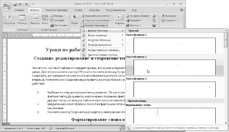 После разбиения вы можете изменить ширину колонок, перемещая прямоугольный маркер, который появится на линейке. Для дополнительной настройки колонок выберите вариант Другие колонки (см. рис. 5.57). В появившемся окне (рис. 5.58) ![]() Рис. 5.58. Диалоговое окно Колонки вы можете точно настроить ширину колонок и промежуток между ними, а чтобы разделить колонки вертикальной линией, установите флажок Разделитель. Разбиение документа на страницы Word разбивает документ на страницы автоматически, и вы сразу же можете видеть результат разбиения в режиме Разметка страницы. При необходимости продолжить ввод текста с новой страницы многие пользователи нажимают клавишу Enter, пока курсор не перейдет на следующую страницу, но этот способ является медленным и ненадежным. В этом случае даже незначительное изменение текста на одной из первых страниц полностью разрушит разбиение на страницы во всем последующем тексте. Чтобы начать новую страницу, установите курсор на то место, где должна начинаться новая страница, а затем выполните одно из следующих действий. ? Нажмите кнопку Вставка > Страницы > Разрыв страницы. ? Нажмите сочетание клавиш Ctrl+Enter. При необходимости перенести на новую страницу определенный абзац, щелкните на нем правой кнопкой мыши, выберите в контекстном меню команду Абзац и на вкладке Положение на странице установите флажок с новой страницы. Если вы используете стили заголовков, установите указанный флажок для стиля Заголовок 1, и все заголовки первого уровня в вашем документе автоматически будут начинаться с новой страницы. Нумерация страниц Для нумерации страниц вам нет необходимости вручную проставлять номера на каждой из них, поскольку Word справится с этой задачей намного эффективнее и избавит вас от множества проблем. Чтобы вставить номера страниц, выполните команду Вставка > Колонтитулы > Номера страниц и выберите в появившемся меню один из вариантов расположения номера (рис. 5.59). Для дополнительной настройки способа нумерации выполните команду Формат номеров страниц. В появившемся окне можно настроить формат номера и указать, с какого числа следует начинать нумерацию. При необходимости скрыть номер на первой странице дважды щелкните кнопкой мыши на номере страницы, после чего Word перейдет в режим редактирования колонтитулов, а на ленте появится вкладка Работа с колонтитулами: Конструктор. ![]() Рис. 5.59. Вставка номеров страниц На этой вкладке вам следует установить флажок Особый колонтитул для первой страницы в группе Параметры. Колонтитулы Колонтитул – это текст, отображаемый вверху и внизу каждой страницы документа. Чаще всего колонтитулы используются для отображения номеров страниц, названий разделов и другой информации. При вставке номеров страниц они будут помещены в соответствующий колонтитул автоматически. Для размещения другого текста придется заняться редактированием колонтитулов. Для создания колонтитула нажмите кнопки Верхний колонтитул или Нижний колонтитул, которые расположены в группе Вставка > Колонтитулы. В появившемся меню вы можете выбрать одну из встроенных заготовок колонтитулов (рис. 5.60) или начать ручное редактирование колонтитулов, выполнив команду Изменить верхний (нижний) колонтитул. После выполнения одной из указанных команд вы перейдете в режим редактирования колонтитула, в котором 