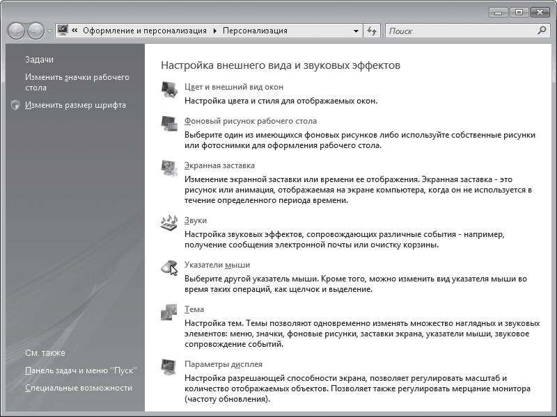 В составе Windows имеется более 20 наборов указателей мыши – схем. Сменить их можно, используя список Схема. Настройка темы Рабочего стола Бывает так: хочется поменять все – и цвет заголовков окон, и фоновый рисунок, и звуки, и указатели мыши. А настраивать все вручную страшно лень. Радуйтесь, лентяи! Специально для вас существуют так называемые темы, то есть наборы всех перечисленных выше параметров. По умолчанию в Vista предлагается две темы: Windows Vista, которая выбирается автоматически при установке Windows, и Классическая, которая использовалась в предыдущих версиях системы. Для переключения на другую тему щелкните кнопкой мыши на ссылке Тема в окне Персонализация и в открывшемся окне обратитесь к раскрывающемуся списку. Если все же есть желание возиться с настройками, можете все изменить вручную, а результат сохранить в виде собственной темы. Для этого нажмите кнопку Сохранить, в открывшемся окне задайте название темы, выберите папку для хранения файла и нажмите кнопку Сохранить. В дальнейшем с помощью списка Тема вы сможете переключаться между собственноручно созданной темой и имеющейся в составе Windows. Настройка параметров монитора Еще одна важная ссылка окна Персонализация называется Параметры дисплея, она вызывает одноименное окно (рис. 2.13, слева). ![]() Рис. 2.13. Окно Параметры дисплея и вкладка Монитор Нетрудно догадаться, что тут можно изменить параметры монитора. Первым делом обратите внимание на ползунок Разрешение. С его помощью вы можете установить подходящее разрешение для вашего монитора. Какое именно? Это вы должны сами решить. Сдвиньте ползунок на новое значение, нажмите кнопку Применить, оцените результат. Если разрешение слишком низкое, на экране помещается слишком мало. Если слишком высокое – значки и текст получаются слишком мелкие. Словом, придется поэкспериментировать. После нажатия кнопки Применить появится предупреждающее окно (рис. 2.14), в котором нужно подтвердить свои намерения или отказаться от них. ![]() Рис. 2.14. Предупреждение об изменении характеристик монитора Если у вас «стеклянный» монитор, стоит потратить время и подобрать оптимальную частоту обновления экрана. Для ее изменения нажмите кнопку Дополнительно, в открывшемся окне перейдите на вкладку Монитор и в раскрывающемся списке попытайтесь установить максимально возможное значение (рис. 2.14, справа). То есть повышайте значение частоты обновления до тех пор, пока монитор что-то показывает. Вы увидите – чем выше частота, тем качественнее изображение. Для жидкокристаллических мониторов этот параметр не так важен. В них вообще используется другой принцип формирования картинки. Поэтому для таких мониторов частоту обновления экрана обычно устанавливают 60 или 75 Гц. С основными ссылками окна Персонализация мы разобрались. Но слева – скромно и сдержанно – располагаются еще две ссылки: Изменить значки рабочего стола и Изменить размер шрифта. Они тоже позволяют изменить внешний вид Рабочего стола.