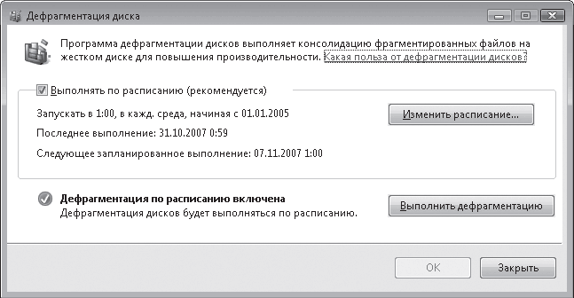 Программные ошибки – это сбои в файловой системе, в результате которых на жестком диске появляются потерянные фрагменты, не принадлежащие ни одному файлу (так называемые lost-кластеры). Место они занимают, а использовать их нельзя. Причиной появления потерянных кластеров могут быть: аварийное завершение работы программ после их «зависания», внутренние ошибки программного обеспечения и Windows, неправильное завершение работы системы (например, при внезапном отключении электропитания) и т. д. Программные ошибки можно устранить, а механически поврежденные участки – это уже навсегда. При проверке диска они просто помечаются и в дальнейшем не используются для записи и чтения данных. В состав Windows входит специальная утилита проверки жесткого диска, с помощью которой можно избавиться от потерянных кластеров и пометить поврежденные. Чтобы запустить ее, выполните команду Пуск > Компьютер, щелкните правой кнопкой мыши на том диске, который хотите проверить, и в открывшемся меню выполните команду Свойства. В открывшемся окне перейдите на вкладку Сервис (рис. 8.14, слева) и нажмите кнопку Выполнить проверку. При этом откроется окно параметров проверки (рис. 8.14, справа). На нем есть два флажка. ![]() Рис. 8.14. Запуск проверки жесткого диска • Автоматически исправлять системные ошибки. Исправление найденных ошибок файловой системы без уведомления пользователя. Это флажок установлен по умолчанию, вот и не снимайте его. Нечего вам забивать голову всякими деталями. Дело человека – осуществлять стратегическое руководство. • Проверять и восстанавливать поврежденные сектора. Если флажок не установлен, диск будет проверен только на наличие программных ошибок. Если его установить, утилита будет искать и программные, и аппаратные проблемы. Это гораздо более длительный процесс. Для начала проверки нажмите Запуск. Но тут вас может ждать сюрприз: система сообщит, что диск нельзя проверить, потому что он используется какими-то программами. Чаще всего это означает, что вы хотите проверить диск, на котором установлена операционная система. Утилита предложит вам отложить проверку до следующего запуска системы. Выбора нет, соглашайтесь. Если хотите, чтобы проверка началась быстрее, придется перезагрузить компьютер. Проверка будет проведена в момент загрузки системы. Придется сидеть и ждать. Но даже если проверка успешно началась, все равно придется сидеть и ждать. Во время проверки диска лучше не запускать никаких программ. Дефрагментация диска Вторая кнопка в окне, изображенном на рис. 8.14, слева, отвечает за выполнение дефрагментации диска. Что это такое? Дело в том, что с течением времени жесткий диск постепенно заполняется файлами: постоянно создаются новые, реже удаляются ненужные, файлы переписываются с место на место… В результате файлы на диске располагаются очень нерационально: между ними образуются незанятые фрагменты, а разные куски одного и того же файла могут оказаться на разных участках диска. Это приводит к тому, что обращение к данным занимает слишком много времени. И диск крутится гораздо интенсивнее, что никак не увеличивает срок его службы. Гораздо удобнее, когда файлы расположены аккуратненько, без пробелов, без деления на части. Для решения этой проблемы и нужна дефрагментация – процесс перераспределения файлов на жестком диске, в р