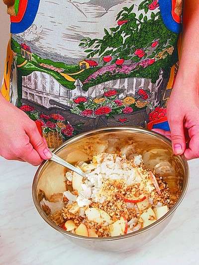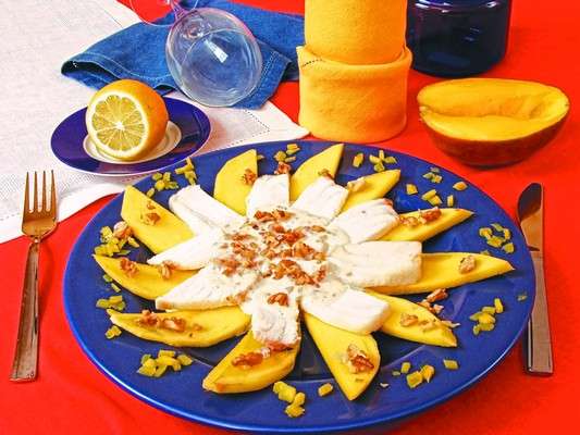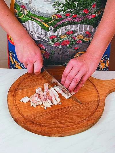 Салаты из рыбы и морепродуктов «Зимний вечер» ![]() Продукты На 1 порцию: 100 г консервированной печени трески в масле, 1 яйцо, 40 г консервированного зеленого горошка, 1 клубень картофеля, зеленый лук, соль. Картофель отварить, нарезать небольшими кубиками. Сваренное вкрутую яйцо очи-стить от скорлупы, нарезать отдельно желток и белок. Часть измельченного белка оставить для украшения салата. Из печени трески в небольшую емкость слить масло. Печень трески нарезать, положить во вме-стительную емкость, добавить нарезанный кубиками картофель и измельченное яйцо. Зеленый лук нашинковать, затем вместе с консервированным зеленым горошком поместить в емкость с печенью трески, картофелем и яйцом. Полученную массу посолить, заправить маслом от консервированной печени трески, затем все перемешать. Готовый салат украсить измельченным белком. Совет хозяйке: Открытые рыбные консервы следует хранить в стеклянной или фарфоровой посуде в прохладном месте не более 6 часов «Заморский» ![]() Продукты На 1 порцию: 20 г филе консервированных анчоусов в масле, 20 г сыра, 50 г пшеничных сухариков, 1 зубчик чеснока, листья салата, соль, перец черный молотый. Листья салата промыть под проточной водой, подождать, пока стечет вода, а затем нашинковать. Глубокую емкость натереть зубчиком чеснока. Затем поместить в нее нашинкованные листья салата. Оставшуюся часть зубчика чеснока измельчить при помощи чеснокодавилки или натереть на мелкой терке. Из консервированных анчоусов слить масло в небольшую емкость. Филе анчоусов положить в небольшую емкость, размять вилкой. Нарезанные листья салата за-править маслом от консервированных анчоусов, добавить измельченный зубчик чеснока, соль, черный молотый перец. Затем тщательно перемешать и оставить в прохладном месте, чтобы листья салата пропитались маслом. Затем листья салата поместить в салатницу, поверх них положить пшеничные сухарики. Сыр измельчить на крупной терке и поместить в салатницу следующим слоем поверх сухариков. Для этого салата желательно выбрать плоское блюдо, по краям которого можно положить украшения, изготовленные из листьев салата. ![]() Глубокую емкость натереть зубчиком чеснока, остаток зубчика измельчить. ![]() Из консервированных анчоусов слить масло в небольшую емкость. ![]() Филе анчоусов положить в неглубкую миску, размять вилкой. ![]() Листья салата заправить маслом от консервированных анчоусов, посолить, поперчить. ![]() Затем выложить салат в плоскую салатницу, сверху положить пшеничные сухарики. ![]() Сыр измельчить на крупной терке и поместить в салатницу следующим слоем поверх сухариков. «Экзотический» ![]() Продукты На 1 порцию: 100 г белуги, 100 г манго, 30 г белого вина, 30 г очищенных грецких орехов, 2 ст. ложки майонеза, 1 ч. ложка лимонного сока, 1 ч. ложка измельченного хрена, 1/2 моркови, 1/2 луковицы, зелень петрушки, сахар. Белугу или другую белую рыбу вымыть, очистить, поставить варить в подсоленной воде с добавлением зелени петрушки, репчатым луком и морковью. Когда вода закипит, добавить белое вино и лимонный сок. Манго очистить от кожицы, разрезать пополам, а затем нарезать полукружиями. Отваренную белугу остудить, некрупно нарезать ломтиками. В небольшую емкость положить майонез, добавить измельченный хрен, сахар, тщательно перемешать. Очищенные грецкие орехи измельчить, пропустив один-два раза ч