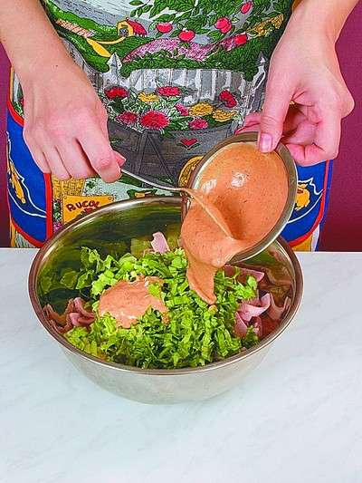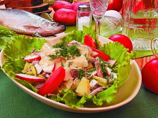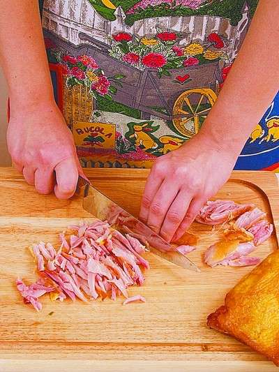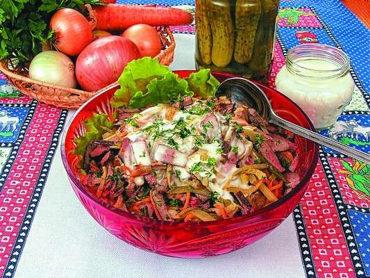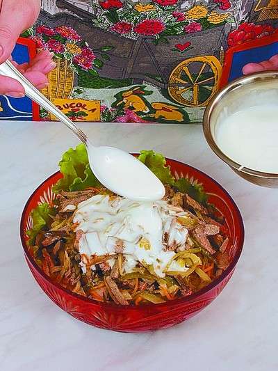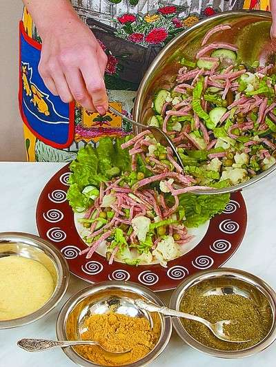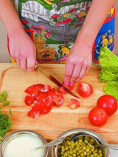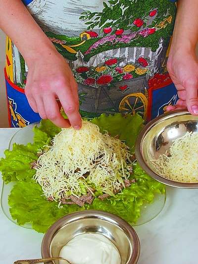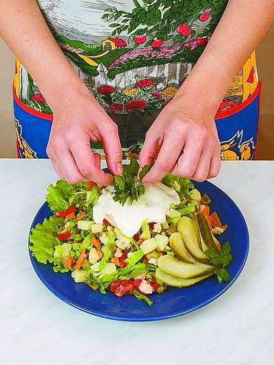 Салаты из мяса и птицы «Королевский» ![]() Продукты На 1 порцию: 80 г говядины, 50 г маринованных шам-пиньонов, 1 маринованный огурец, 1 луковица, 2 ст. ложки майонеза, зеленый лук, зелень укропа, соль, перец черный молотый. Мясо тщательно вымыть, удалить пленки, положить в кастрюлю и отварить на среднем огне. Отваренное мясо остудить, нарезать соломкой. Репчатый лук очистить, разрезать пополам, а затем нарезать полукольцами. Зеленый лук и зелень укропа нашинковать, оставив несколько веточек для украшения готового салата. Говядину, репчатый лук и укроп положить в емкость. Лучше выбрать глубокую, чтобы было удобнее перемешивать салат. В небольшую емкость налить немного маринада из-под огурцов, смешать с майонезом, добавить в емкость с говядиной и оставить в про-хладном месте не менее чем на 1 час. Маринованные шампиньоны или другие грибы нарезать. Маринованный огурец нарезать вдоль так, чтобы получились тонкие ломтики, а затем их мелко нарезать соломкой. Затем нарезанные огурец и грибы положить в емкость с приготовленными говядиной, луком и укропом, посолить, поперчить, все перемешать. Салат поместить в салатницу, украсить небольшими грибочками и веточками укропа. «Городской» ![]() Продукты На 1 порцию: 1 небольшой клубень картофеля, 60–80 г ветчины, 1 морковь, 1–2 свежих огурца, 1 яйцо, 1 ст. ложка майонеза, 1 ст. ложка томатного соуса, листья салата, зелень петрушки, соль, черный молотый перец. Клубень картофеля и морковь отварить, очистить от кожицы, нарезать некрупными кубиками. Сваренное вкрутую яйцо очистить от скорлупы и мелко нарезать. Один огурец очистить от кожицы, нарезать небольшими кубиками. Другой огурец, не очищая от кожицы, нарезать тонкими ломтиками и оставить для украшения готового салата. Чтобы огурец не потерял много сока, его лучше нарезать перед тем, как подать салат к столу. Ветчину нарезать некрупной соломкой или небольшими кубиками. Для приготовления салата лучше выбрать свиную ветчину. Несколько листьев салата оставить для украшения блюда, остальные нашинковать. В небольшую емкость положить майонез, добавить томатный соус, черный молотый перец, затем перемешать. Нарезанные овощи, ветчину, яйцо и салат положить во вместительную емкость. Приготовленным соусом заправить салат, затем добавить соль, все тщательно перемешать. Салат украсить зеленью и огурцом, нарезанным тонкими ломтиками. ![]() Сваренное вкрутую яйцо очистить от скорлупы и мелко нарезать. ![]() Огурец очистить от кожицы, нарезать небольшими кубиками. ![]() Свиную ветчину нарезать некрупной соломкой или небольшими кубиками. ![]() Несколько листьев салата оставить для украшения блюда, остальные нашинковать. ![]() В небольшую емкость положить майонез, добавить томатный соус, перец, затем перемешать. ![]() Приготовленным соусом заправить салат, затем добавить соль, все тщательно перемешать. Салат из говядины ![]() Продукты На 1 порцию: 100 г говядины, 1 морковь, 1 клубень картофеля, 50 г консервированной красной фасоли, 2 яйца, 1/2 зеленого яблока, 20 г сливочного масла, 2 ст. ложки сметаны, листья салата, зеленый лук, соль. Картофель отварить, очистить от кожицы, разрезать пополам, а затем нарезать полукружиями или кубиками. Отварить морковь, очистить от кожицы, некрупно нарезать полукружиями. Средних размеров зеленое яблоко, не очищая от кожицы, нарезать кубиками, предварительно удали