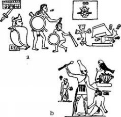 ГЛАВА ВТОРАЯ ПОТЕРЯННОЕ ЦАРСТВО КАИНА?Столица ацтеков Теночтитлан — какой ее увидели испанцы — производила сильное впечатление. Судя по рассказам путешественников, город был едва ли не крупнее большинства европейских столиц, отличался удобной планировкой и порядком. Расположенный на острове озера Тескоко в межгорной котловине, он со всех сторон был окружен водой и разделен каналами — настоящая Венеция Нового Света. Испанцев поразили длинные и широкие дамбы, соединявшие остров с берегом озера, снующие вдоль каналов многочисленные каноэ, многолюдные улицы и рынки, до отказа заполненные торговцами и товарами со всей империи. Многочисленные комнаты императорского дворца отличались богатым убранством, а сам дворец был окружен садами и парками, среди которых располагался вольер для певчих птиц и зоопарк. На громадной площади перед дворцом устраивались праздники и военные парады. Сердцем города и всей империи считался огромный религиозный центр — прямоугольное пространство площадью более миллиона квадратных футов, — окруженный стеной, по форме напоминавшей извивающихся змей. Внутри этого святилища располагались многочисленные постройки, самыми внушительными из которых были Главный Храм с его двумя башнями и полукруглый храм Кетцалькоатля. В современном Мехико кафедральный собор с прилегающей площадью и несколькими улицами занимает лишь часть этого древнего святилища. После частичных раскопок, проведенных в 1978 году, теперь можно увидеть и даже посетить отдельные помещения Главного Храма. За последнее десятилетие ученые достаточно хорошо изучили грандиозное святилище, и теперь мы знаем, как выглядело это место в эпоху своего расцвета. Главный Храм имел вид ступенчатой пирамиды высотой около 160 футов и основанием 150 на 150 футов. Строительство его велось в несколько этапов: как в русской матрешке, стены большего по размерам храма возводились вокруг меньшего, который, в свою очередь, охватывал еще более древнюю постройку. Всего насчитывалось семь вложенных друг в друга зданий. Археологи смогли вскрыть культурные слои вплоть до второго храма, который был построен примерно в 1400 году нашей эры и имел, как и последний, две башни на самой верхушке. Северная башня представляла собой храм, посвященный Тлалоку, богу бурь и землетрясений (рис. За). Южная башня была святилищем главного бога ацтеков Уицилопочтли который почитался как бог войны. Обычно его изображали с волшебным оружием в руках, которое носило название Огненного Змея (рис. Зb) и при помощи которого он победил четыреста второстепенных богов. На вершину пирамиды с западной стороны вели две величественные лестницы — к каждой из башен-храмов. Основанием лестниц служили две каменные головы свирепых змей, Огненного Змея Уицилопочтли и Водяного Змея, символа Тлалока. В основании самой пирамиды археологи обнаружили толстый каменный диск, в верхней части которого было вырезано изображение расчлененного тела богини Койоль-шаухки (рис. Зс). Согласно ацтекским мифам, она была сестрой Уицилопочтли и приняла смерть от его же руки, когда участвовала в мятеже вместе с четырьмя сотнями других богов. Вполне возможно, что ее судьба стала одной из причин кровожадных традиций ацтеков, которые верили, что умиротворить бога войны можно только при помощи сердец, вырванных из груди 