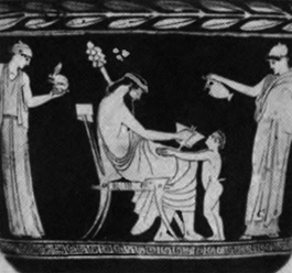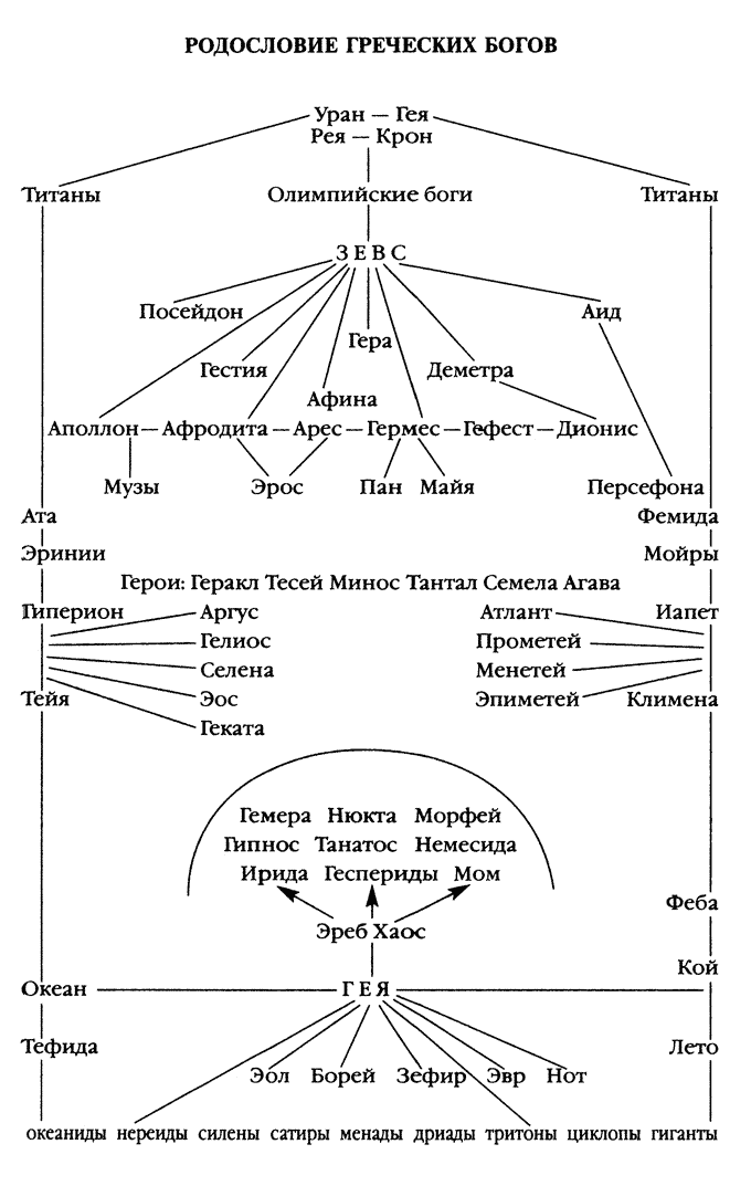 Приложение Карта обитания греческих богов Родословие греческих богов Иллюстрации Младенец Зевс, младший сын Кроноса и Реи, на острове Крит с нимфой Амалфеей и богом Паном. Титан Океан — водный поток, окружающий обитаемый земной диск. Тифон, сын Геи и Тартара, заточенный Зевсом под горой Этна в Сицилии. Кентавр Грифон Тритон, морское божество, сын Посейдона и нереиды Амфитриты, похищающий нимфу. Битва лапифов (племя гигантов) с кентаврами. Рея вручает Кроносу камень вместо новорожденного Зевса. Протеида, морская богиня, одна из дочерей Протея, сына Посейдона. Гидра, порождение Тифона и Ехидны, побеждаемая Гераклом и Иолаем. Афина Паллада — дочь Зевса, вечно девственная богиня, воительница. Посейдон, Аполлон и Артемида. Арес — бог войны, сын Зевса и Геры. Аполлон-кифаред. Музы: Талия Терпсихора Урания Каллиопа Мельпомена Полигимния Эвтерпа Афродита в окружении сатиров. Артемида Афродита Анадиомена, «рожденная из пены». Аполлон, льющий жертвенное вино, и его ипостась — ворон, указывающий место основания города. Зевс и Лето с детьми-близнецами Аполлоном и Артемидой. Силен — демон плодородия, воплощение стихийных сил природы. Дионис с сатиром и менадами. Дионис и силен. Сатир — природный демон, дикое, насмешливое существо. Приап (изначально фаллос) — божество производительных сил природы. Деметра и ее дочь Персефона в подземном мире Аида. Асклепий, бог врачевания, и его дочь Гигиея, богиня здоровья. Дионисии — праздник в честь бога Диониса; фаллическая процессия менад и сатиров. Состязание бога Аполлона и сатира Марсия (играет на флейте), слева — Афина. Геракл (с львиной шкурой и палицей) и аргонавты. Вознесение Геракла, как нового бога, на Олимп. |