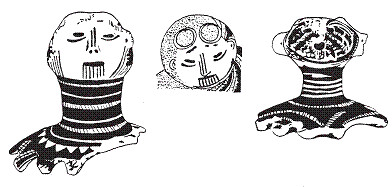 Крышка сосуда в виде человеческой головы в скафандре У нас есть и довольно оригинальное, хотя и не выходящее за рамки здравого смысла объяснение «Неба с большой головой». О нем мы скажем чуть позже. Почему мы думаем, что космопилоты должны быть обязательно в скафандрах и шлемах, с антеннами и манипуляторами? Почему они должны прилететь именно на летательном аппарате? Почему вообще они нам должны что-то оставить? Все это — не более чем архетипы нашего, человеческого сознания, аналогии с тем, что мы уже когда-то, пускай даже в фантастических фильмах, видели. К сожалению, в большинстве случаев мы способны действовать и мыслить лишь по аналогии, ища ответ всегда в области известных нам стереотипов, хотя сами об этой стереотипности можем и не догадываться. Истинный же ход событий, особенно если мы говорим об истоках и способах передачи эзотерических знаний, может просто не поддаваться ни осмыслению, ни прочувствованию. Ну, скажем, разве не возможен контакт не в виде физического взаимодействия (беседы, посещения, дарования каких-то механизмов), но исключительно в виде духовного общения? Не случайно в китайской эзотерической традиции говорится о том, что предки и потомки входят в «духовное соприкосновение», или «духовную встречу». В этот момент временной континуум исчезает, он превращается в «вечно длящееся настоящее» (выражение из китайского чань-буддизма). Именно этой идее пространственно-временного континуума подчинены многие трактаты философской мысли Древнего Китая. Не упрощаем ли мы сами себе жизнь, когда ищем исток загадочных сверхзнаний в космосе? Реальность всегда более мистична, более неожиданна, более эзотерична, чем мы сами можем предположить. Космическая теория — не более чем бегство от загадок этой внутренней реальности мира, изящная, но очень вязкая, а поэтому и чрезвычайно опасная ловушка. Но все же удивительная система знаний существовала, и «воспоминания о ней» можно до сих пор встретить в закрытых школах на Дальнем Востоке, и с этим фактом спорить чрезвычайно трудно. Попробуем подойти к этой проблеме с другой стороны — земной. Она не менее загадочна, чем небесная. |