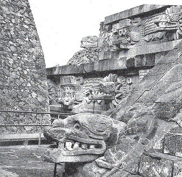 Драконы Теотихуакана Это — город грандиозный и загадочный. Он по ритуальному строг и по мистически молчалив. Это — Теотихуакан, лежащий на Мексиканской равнине, который представлял когда-то огромный комплекс ритуальных сооружений, пирамид, построек, четко очерченных улиц. Это — символ величия и расцвета цивилизации поздних ацтеков. Это — знак мирной теократии классического периода развития Мезоамерики между III и X вв. нашей эры. Сам же Теотихуакан возник несколько раньше — приблизительно в 150 г., и именно с этого момента начинается классический период существования Мезоамериканской культуры. Ацтеки помещали здесь развертывания событий своих космогонических мифов, а посещение священного Теотихуакана считалось обязательным паломничеством для многих правителей и жрецов. Именно сюда регулярно приходил для совершения ритуалов последний из великих правителей ацтеков — знаменитый Монтесума II. Постройки древнего Теотихуакана расположены вдоль двух осей, находящихся под прямым углом друг к другу, и четко ориентированы по линиям север-юг и запад-восток. Вся символика города связана прежде всего с комическими циклами, не случайно одним из первых сооружений, построенных еще до 150 г. (то есть до начала классического периода), была величественная Пирамида Солнца. Приблизительно через пятьдесят лет на оконечности северо-южной оси была возведена Пирамида Луны, завершив тем самым знаменитый ритуальный «путь мертвых» в Теотихуакане. Даже сегодня полуразрушенный Теотихуакан поражает своим величием и необычностью архитектуры. И одно из самых удивительных сооружений — храм Кецалькоатля, где, вероятно, и находилось место правителя. По фасаду храма, построенного в виде традиционной многоступенчатой пирамиды, мы видим головы и вытянутые шеи змей, как бы вылезающих из стен здания. У этих змей — огромные вытянутые морды, клыки, хищно открытая пасть, их голова находится в обрамлении то ли перьев (символ Кецалькоатля), то ли языков пламени. Но разве мы не встречали практически те же амые изображения за тысячи километров от Теотихуакана? Китайский императорский дворец Гугун в «Запретном городе» в Пекине — символ величия китайского абсолютизма и одно из самых грандиозных мировых сооружений архитектуры. Практически в каждом из его многочисленных дворов мы можем встретить изображения драконов — символа священной императорской власти. Есть здесь и головы драконов, вырезанных из гранита, — и они удивительным образом совпадают с головами змей из храма Кецалькоатля. Сами же изображения в императорском дворце в Пекине воспроизводят значительно более древние изображения драконов, которые можно обнаружить еще в I тыс. до н. э., причем они обладали все теми же характерными чертами: оскал ядовитых зубов, языки пламени или оперение, которое окружает голову и многое другое. Может даже показаться, что какой-то скульптор просто скопировал китайских драконов из древнейших поселений в провинциях Хэнань и Шаньдун и, даже не внеся своего творческого индивидуализма в изображение, просто поместил на стены храмов в Теотихуакане. Заглянем и в китайские даосские монастыри — обители тех, кто хранят древнюю мудрость общения с духами ушедших предков и знают секреты достижения духовного бессмертия. Практически в каждом таком монастыре мы можем увидеть ка