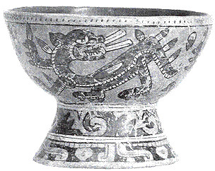Изображения змей (драконов?) на стенах храма Кецалькоатля в Теотихуакане Ацтекская чаша с изображением драконов Конечно, эти предания далеко не во всем совпадают. Следует учитывать, что у ацтеков в центре поклонений стояли крылатые духи в перьях — поэтому ацтекская праматерь вводит в себя шарик из перьев. А китайцы считали птиц перевозчиками душ в царство мертвых и воплощением духов предков — потому китайская праматерь беременеет от яйца птицы. Но и в том, и в другом случае речь идет о неких крылатых и оперенных символах духов предков — ведь и в том, и в другом случае фигурируют птицы-оборотни. Для Китая «священная птица» (сю-ань няо) отнюдь не соответствует некой средней зоологической птице. Это прежде всего представитель загробного царства, который благодаря своей способности быстро перемещаться по воздуху и выполняет функции связующего моста между двумя мирами. Точно так же и мезоамериканские «пернатые божества» выступали в виде посланников из иного мира. И они поразительным образом оказываются похожи не только по способу рождения, но и по внешнему виду. Обратим внимание и на другую особенность: прародители ацтеков и китайцев не появляются на земле обычным физиологическим образом: Хуитзилопочтли выходит из шеи своей матери после того, как ей отсекли голову, а предок рода Шан выходит на свет после того, как его матери рассекают живот. Как видим, здесь между этими народами много похожего и в архитектуре, и в верованиях, и в представлении о духах, и даже в материальной культуре.