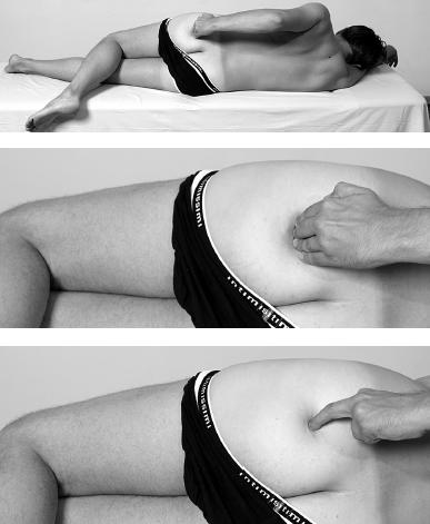 Между мышечным пучком подвздошно-поясничной мышцы может ущемляться кожный бедренный нерв. При этом возникают онемение и нарушения чувствительности по передненаружной поверхности бедра (невралгия Бернарда-Рота). При функциональном ограничении подвижности крестцово-подвздошного сустава выявляют болезненный спазм подвздошной мышцы в положении лежа на спине с ногами, слегка согнутыми в коленных суставах. Если этот спазм встречается с одной стороны, то он имеет очень ценное диагностическое значение. Прощупать подвздошную мышцу можно сбоку на поверхности таза. При наличии спазма при прощупывании под пальцами ощущается болезненный валик. Правда, прощупать ее у самого себя бывает достаточно сложно. Упражнение 83 (поглаживание при болях в бедре, а также при болях, которые могут дифференцироваться больным как боли в брюшной полости и малом тазу) Все упражнения при синдроме подвздошно-поясничной мышцы выполнять лежа на спине, здоровая нога согнута в коленном и тазобедренном суставах и опирается на кушетку, туловище на краю кушетки. Больная нога согнута в коленном суставе и свободно свисает с продольного края кушетки. Для уменьшения болевых ощущений при синдроме подвздошно-поясничной мышцы используется следующий прием миотерапии, который выполняется одним большим или несколькими пальцами, подушечкой (бугром) кисти или всей ладонью. При выполнении этого приема ладонная поверхность фаланги большого пальца, т. е. подушечка большого пальца двигается непрерывно в продольном направлении по передней поверхности бедра. Продольное линейное поглаживание Выполняется подушечкой среднего пальца руки с одноименной стороны, движениями вверх и вниз по ходу иррадиации болевых ощущений по передней поверхности бедра в течение 1 минуты, 6–15 раз. Поперечно-боковое поглаживание Выполняется аналогично предыдущему, только в поперечном направлении. Поглаживание «рубанком» Производится по передней поверхности бедра от паховой области вниз с большим усилием и обратно — с меньшим, имитируя работу рубанком. Полукруговое поглаживание Выполняется краем большого пальца около ногтя от паховой области вниз по ходу иррадиации боли. Эффективность приема возрастает с увеличением скорости движения. Упражнение 84 (вибрационное пощипывание) Выполняют в том же положении двумя или тремя пальцами, сложенными в виде щипцов. Захваченную часть ткани, где расположена болевая зона, встряхивают, придавая ей колебательное (дрожательное) движение: сначала легкое, затем более интенсивное. Вначале встряхивают подвздошную мышцу при наличии болевой точки выше паховой складки, захватывая кончиками пальцев и вращая в продольном или поперечном направлении. Затем сжимают кожу, подкожную клетчатку и мышцу в складке. После этого сообщают колебательное (вибрирующее) движение вперед-назад, осуществляя нажимы и надавливания на болевую область. Надавливания осуществляют подушечками пальцев (одним или несколькими пальцами одновременно) или кончиком большого пальца. Далее находят болевые зоны по передней поверхности бедра и проводят последовательно аналогичные приемы миотерапии. Упражнение 85 При отечности тканей в паховой области и передней поверхности бедра кончиками большого, указательного и среднего пальцев в очень быстром темпе проводят пальцевые уколы в бол