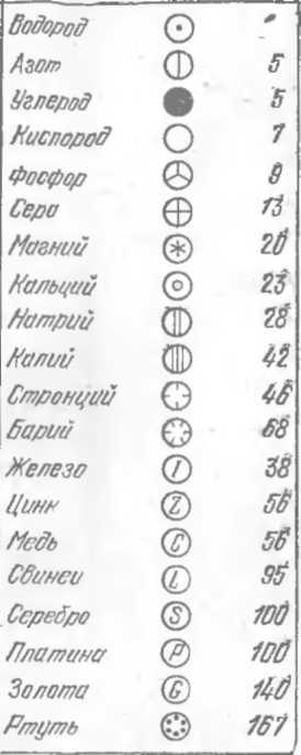 Один биограф Дальтона говорит о нем так: «Дальтон был атомист до мозга костей. Он был глубоко убежден в правильности взглядов Ньютона. Для него его атомы - «твердые, непроницаемые, подвижные» - были такой же реальностью, как если бы он видел их собственными глазами и трогал руками. В своем воображении он видел в воздухе атомы кислорода, азота и водяного пара. Он рисовал их на бумаге». Приведем из книги Дальтона значки, обозначающие атомы разных химических элементов, и их атомные массы (см. таблицу; за единицу массы по-прежнему принята масса атома водорода). Таковы те первичные частицы, те атомы, те «кирпичи мироздания», из которых, по Дальтону, состоят все тела на свете. Комбинация из нескольких атомов образует молекулу («сложный атом», как говорил Дальтон); сложные тела состоят из одинаковых молекул - такие тела являются химическими соединениями, например вола или аммиак, и их состав в процентах может быть легко вычислен, если знать состав молекулы (например, Химические реакции, по Дальтону, заключаются в том, что атомы вступают друг с другом в разные комбинации, образуя «сложные атомы» (молекулы), затем эти молекулы распадаются, образуются новые молекулы и т. д., подобно тому, как танцоры, переходя от одного танца к другому, образуют новые комбинации. Но сами атомы при этом остаются неизменными и вечными: меняется только их распределение. «Каждая частица воды,- говорит Дальтон в своей «Химической философии»,- в точности похожа па любую другую частицу воды; каждая частица водорода в точности похожа на любую другую частицу водорода и т. д. Химическое разложение и химическое соединение означают лишь то, что атомы удаляются друг от друга или же снова сцепляются вместе. Но химик не способен уничтожить материю или создать ее вновь. Пытаться создать или уничтожить хотя бы один атом водорода так же безнадежно, как пытаться прибавить еще одну планету к Солнечной системе или уничтожить какую-нибудь из существующих планет. Все, что мы можем сделать,- это разъединить атомы, соединившиеся или сцепившиеся друг с другом, или же соединить те атомы, которые сейчас находятся на большом расстоянии друг от друга». «Химическая философия», изложенная в этих строках Дальтона, действительно стала философией целого ряда поколений химиков и физиков. Невозможность создания хотя бы одного нового атома данного химического элемента, невозможность превращения одних атомов в другие - все это было необходимым выводом из всего огромного опытного материала, на котором основывалась научная химия. Когда-то, в средние века, химики - тогда они назывались алхимиками - поставили своей целью искусственное приготовление золота; но это невозможно, как следует из «химической философии» Джона Дальтона, потому что ведь золото - это химический элемент, и, значит, невозможно ни создать, ни разрушить хотя бы один-единственный атом В этом пункте Дальтон не совсем сходился с Бойлем, который в 1661 году писал, что хотя атомы остаются неизменными при всех химических явлениях, но тем не менее когда-нибудь будет найден некий «сильный и тонкий агент», с помощью которого удастся разбить атомы на более мелкие части и превратить одни атомы в другие. Эта мысль Бойля казалась Дальтону чистой фантазией: ни один химический факт не указывал на то, что атомы возможно разбивать на части и превращать