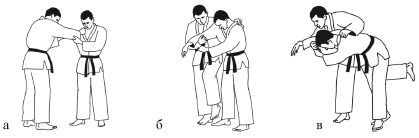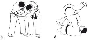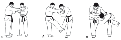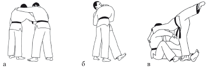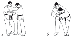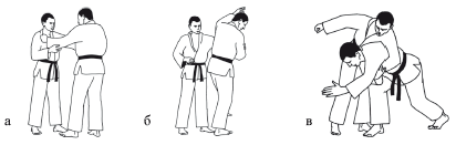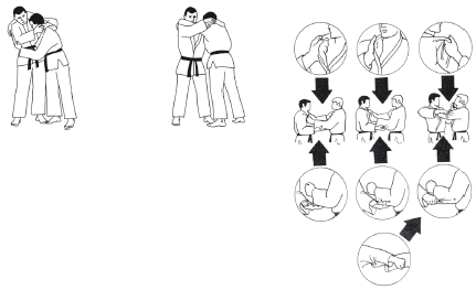 ЧАСТЬ 4 ТЕХНИЧЕСКИЕ ДЕЙСТВИЯ В БОРЬБЕ ДЗЮДО Основой системы дзюдо является техника выполнения приемов борьбы, которая имеет различия в каждом из ее разделов, зависящих от особенности взаимного расположения противников. БОРЬБА СТОЯ Для проведения приемов при борьбе стоя большое значение имеет особенность приобретенного захвата. Без захвата (обхвата) невозможно провести прием. В данном пособии предлагаются наиболее целесообразные захваты, позволяющие проводить броски на противнике, стоящем в любой стойке, в проекции на горизонтальную и сагиттальную плоскости. Захваты при борьбе стоя (стандартные и нестандартные) Следует иметь в виду, что по правилам соревнований борьбы дзюдо использование захватов на ближней дистанции (захват пояса спереди и на спине) и односторонних захватов ограничено временем, что исключает возможность дождаться выгодной пусковой ситуации для проведения броска и требует незамедлительных активных действий по созданию таких ситуаций (проведение динамической подготовки или комбинации). Захват может располагаться в одних и тех же точках, но в условиях одноименной или разноименной взаимной стойки будет различен по кинематическим параметрам и обуславливать проведение различных приемов и в различных направлениях (рис. 4.6–4.19). Сама технология осуществления захвата за отворот и рукав приведена на рисунке 4.20. Поскольку в современном дзюдо акценты переместились с демонстрационного режима на спортивный, некоторые захваты, использовавшиеся при демонстрации бросков проворотом в условиях соревнований, в настоящее время противопоказаны (рис. 4.21). Выведения из равновесия Для проведения бросков, для осуществления защиты, проведения подготовок к броскам необходимо научиться выводить противника из равновесия. ВЫВЕДЕНИЯ ИЗ РАВНОВЕСИЯ – ОСНОВА ТЕХНИКИ ДЗЮДО Для проведения броска в борьбе дзюдо необходимо предварительно вывести противника из равновесия, используя при этом тягу с помощью захватов за одежду. Даже если бросок будет выполняться с предварительным отрывом от ковра, необходимо предварительное выведение противника из равновесия, с тем чтобы он не смог организовать квалифицированную защиту в момент выхода атакующего из исходного положения на стартовую позицию. Поэтому в дзюдо значительное внимание уделяется изучению способов выведения из равновесия, как части технического действия, так и как тактической категории. Основу выведения из равновесия составляет воздействие на скелетную основу противника таким образом, чтобы с помощью рычагов лишить его устойчивого равновесия, уменьшить площадь его опоры, сместить проекцию ОЦТ на край опоры, уменьшить площади опоры и лишить свободы вращения плечевой оси (рис. 4.1–4.5). ![]() Рис. 4.1 Способы выведения из равновесия вперед ![]() Рис. 4.2. Способы выведения из равновесия назад ![]() Рис. 4.3. Способы выведения из равновесия в сторону ![]() Рис. 4.4. Способы выведения из равновесия вперед и в сторону ![]() Рис. 4.5. Способы лишения опоры подниманием ![]() Рис. 4.6. За концы рукавов при любой взаимной стойке Рис. 4.7. За разноименный отворот и разноименный рукав при любой стойке Рис. 4.8 За одноименный отворот и разноименный рукав при любой стойке Рис. 4.9 За пояс спереди (на спине) и разноименный рукав при одноименной стойке ![]() Рис. 4.10 За пояс на спине через одноименное плечо и разнои