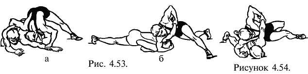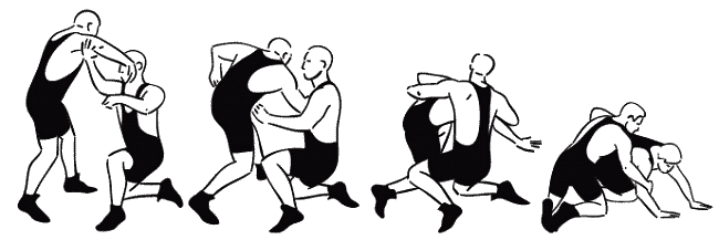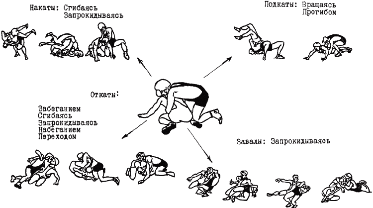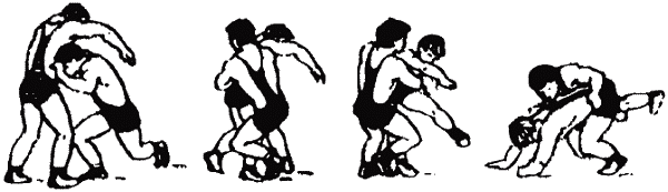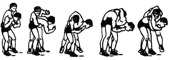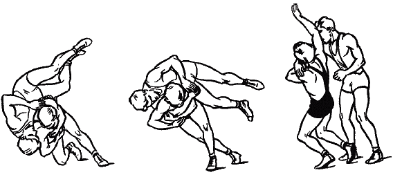 Часть вторая. Практический курс греко-римской борьбы Глава 4. Технические действия в греко-римской борьбе В настоящей главе вместе с содержанием техники атакующих приемов борьбы по традиции представлено содержание защиты, подготовок и контрприемов. Однако это не означает, что технические действия следует осваивать в такой последовательности. В главе 6 будет представлена последовательность их изучения в соответствии с законами педагогики. 4.1. Борьба стоя 4.1.1. Броски Бросками называются приемы, в результате проведения которых противник переводится из положения стоя на спину или на бок. 4.1.1.1. Броски проворотом А. Броски проворачиваясь (тип «провороты») Это броски противника вперед, перед собой с предварительным поворотом к нему спиной или боком. При их выполнении атакующий вначале проворачивается перед противником на угол от 90° до 270° и входит в контакт с ним своим ближним боком, спиной или дальним боком. Затем, продолжая проворот, бросает его перед собой. Основным элементом, влияющим на качество выполнения этих бросков, является максимальное отворачивание своей головы в сторону будущего падения противника и далее. При захватах на дальней дистанции для успешного проведения броска необходимо до входа в контакт с телом противника развернуться на 270°. В этих случаях важна высокая скорость при выходе из исходной позиции на старт броска. Броски проворотом (через туловище) (рис. 4.1.). ![]() Рис. 4.1. Бросок через туловище проворотом При захватах на средней дистанции для успешного проведения броска необходимо до входа в контакт с телом противника провернуться на 180°. При этом броски могут проводиться без собственного падения или с падением после отрыва противника от ковра (рис. 4.2.) с увлечением за собой противника собственным падением (рис. 4.3.), с колен (рис. 4.4.). ![]() Рис. 4.2. Бросок через спину отворотом с падением после отрыва противника от ковра ![]() Рис. 4.3. Бросок через спину отворотом с увлечением за собой противника собственным падением ![]() Рис. 4.4. Бросок через спину отворотом с колен При захватах на ближней дистанции, для успешного проведения броска необходимо до входа в контакт с телом противника провернуться на 90°. При проведении таких бросков требуется использование большой силы (рис. 4.5.). ![]() Рис. 4.5. Броски подворотом (через бок, таз) Все броски типа «проворотом» имеют общую пространственно-тактическую структуру и отличаются друг от друга по динамическим признакам: подъемом вверх, горизонтальным выведением из равновесия, выбиванием всей опоры. Наиболее ответственной фазой бросков проворотом является выход из исходного положения в стартовое (1-я фаза броска). Отдельно по каждому броску к его основному наименованию будет прибавляться способ выхода на старт («входом», «уходом» и т.д.). «Выход» – с поворотом на носке сзади стоящей ноги, вынос впереди стоящей ноги мимо противника на стартовое положение (снаружи одноименной ноги противника) (рис. 4.6.а,б,в.). Этим способом удобно выходить на старт броска проворотом в условиях одноименной и разноименной взаимной стойки. ![]() Рис. 4.6. Броски проворотом класса «выходом» при одноименной стойке «Вход» – вынос впереди стоящей ноги под проекцию общего центра тяжести противника, проворачивание на носках обеих ног и подставление сзади стоящей ноги к впереди стоящей (рис. 4.7.а,б,в,). Этим способом удобн