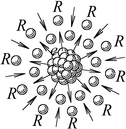 Впрочем, если учесть, что масса реонов, вероятно, ещё меньше, то основная причина гравитации не в этом. Возможно, главная причина асимметрии элементарных сил притяжения и отталкивания зарядов состоит в асимметрии свойств самих элементарных зарядов — электронов и позитронов, из которых, как увидим, сложены атомы и тела (§ 3.9). Считается, что свойства этих частиц полностью симметричны: электрон и позитрон похожи как близнецы, один — это зеркальное отображение другого. А, потому, все их характеристики: радиус, масса, заряд, спин — одинаковы, с точностью до знака. Но, видно, есть всё же ничтожная разница, которая и ведёт к неравноправию электронов и позитронов, суть которого в том, что последних почти нет в свободном состоянии (§ 3.15). Проще всего допустить небольшое различие их радиусов и частот испускания ими частиц (реонов и ареонов). Пусть радиус электрона r, и испускает он в единицу времени N реонов. А радиус позитрона чуть больше R=r+?, и испускает он ежесекундно n ареонов. Сила F воздействия первого заряда на второй пропорциональна числу испускаемых первым частиц на сечение (квадрат радиуса) второго (Рис. 6 и Рис. 45). Всего четыре разных силы: 1) сила отталкивания электрона другим электроном F1=kNr2; 2) сила отталкивания позитрона другим позитроном F2=knR2; 3) сила притяжения электрона позитроном F3=knr2; 4) сила притяжения позитрона электроном F4=kNR2.