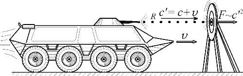 Первая пуля долетит до цели за время t1=L1/v1, где L1 — расстояние до мишени, первоначально равное L (Рис. 25.а), а v1 — скорость пули, равная сумме стандартной скорости c вылета пуль из ствола пулемёта и скорости v броневика в этот момент: t1= L/(c+v). Следующая пуля прибудет к цели за время t2=T+L2/v2, где T — время, прошедшее от первого выстрела до второго, а L2/v2 — собственно время движения второй пули. Отрезок L2, который ей предстоит пройти, будет меньше L на величину пройденного броневиком за время T пути, равного vT, то есть L2= L-vT (Рис. 25.б). Иной окажется и скорость пули v2. Броневик движется ускоренно, и спустя время T скорость его будет на величину aT больше первоначальной. И настолько же скорость второй пули будет превышать v1, т. е. v2= v1+aT= c+v+aT. В итоге имеем t2 = T+((L-vT)/(c+v+aT)) Промежуток времени T?= t2-t1 между двумя ударами пуль в мишень найдётся как T' = T(1-v/(c+v+aT)-La/((c+v+aT)(c+v))) Считая малыми в знаменателях величины v и aT (в сравнении со скоростью выброса пуль c), получим T?/T=1-?/c-La/c2, или то же для частот (f=1/T): f?/f= 1+?/c+La/c2. То есть пули по мишени барабанят чаще (с частотой f?>f), чем вылетают: движение как бы добавляет пулемёту скорострельности.