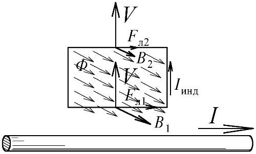 Впрочем, и формула Вебера была эмпирической. Строго её обосновал Вальтер Ритц, получив формулу, как прямое следствие открытого им механизма взаимодействия элементарных зарядов (электронов) — посредством обмена стандартными микрочастицами (реонами). Именно так он вывел из своей модели силы магнитного взаимодействия (§ 1.7). В своём главном труде [8] Ритц объяснил не только все магнитные эффекты, но и явление электромагнитной индукции, открытое Фарадеем. Суть его в том, что изменение магнитного потока Ф вектора B через замкнутый контур (скажем, проволочное кольцо) наводит в этом контуре ЭДС индукции, создающей ток индукции и, по правилу Ленца, мешающей изменению потока [60]. Рассмотрим прямоугольную проволочную рамку и лежащий в её плоскости проводник с током (Рис. 18). По закону Фарадея, удаление рамки от провода со скоростью V наведёт в рамке ЭДС индукции U =-dФ/dt. Но и эта индукционная сила, по своей природе, — чисто электрическая, ибо, подобно магнитной силе, вызвана малым изменением электровзаимодействия зарядов от их движения. Как легко вычислить, ЭДС U =-dФ/dt создаётся разницей сил Лоренца Fл1—Fл2, действующих на заряды в ближнем и дальнем участке рамки, поскольку поле B2 меньше, чем в ближнем B1 [45]. В силу классического принципа относительности, то же получим и в случае, если рамка неподвижна, а удаляется проводник с током. Сложнее случай, когда провод и рамка неподвижны, но меняется ток в проводнике и создаваемое им магнитное поле B и его поток Ф через рамку (Рис. 19). В этом случае, из-за эффекта Ритца и запаздывания электрических воздействий разные участки рамки воспримут воздействие движущихся с ускорением a зарядов проводника с разным запозданием и интенсивностью. Это снова породит электрическую силу индукции U=-dФ/dt и ток в рамке.