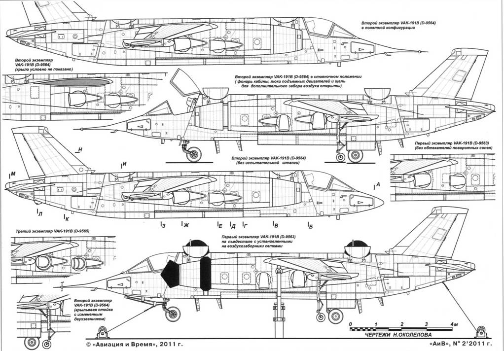 Постройка опытных образцов самолета VAK 191В Из-за установки ПМД в центральной части фюзеляжа для VAK 191В выбрали схему высокоплана. Улучшая устойчивость, крылу придали отрицательный угол поперечного «V» -12°30'. Для снижения посадочной скорости при посадке с пробегом и уменьшения длины переходного участка при вертикальном взлете крыло оборудовали закрылками и зависающими элеронами. Хвостовое оперение состояло из цельноповоротного стабилизатора с размахом 3,41 м и киля с рулем направления. Как и крыло, стабилизатор стоял с отрицательным углом поперечного «V» -8°. Передний подъемный двигатель расположили за кабиной летчика, за ним следовал передний топливный бак и воздушный канал ПМД. Под баком находился герметичный отсек для разведывательного оборудования. Свободный объем под ПМД занимал небольшой грузовой отсек, в котором можно было разместить одну ядерную бомбу или дополнительное разведоборудование, или топливный бак. Обычное вооружение хотели подвешивать на четыре подкрыльевых пилона. В хвостовой части фюзеляжа установили топливные баки, за которыми размещались задний подъемный двигатель и отсек с вспомогательной силовой установкой. Она обеспечивала самолету независимость от специальных наземных средств обслуживания и открывала возможность для скрытного базирования на неподготовленных площадках. Для полетов с таких площадок, в том числе и с травяным покрытием, VAK оборудовали велосипедным шасси с пневматиками низкого давления. Небольшие поддерживающие стойки убирались в обтекатели на крыле. При рулежке переднее колесо управлялось от педалей. Для уменьшения дистанции пробега в хвостовой части стоял контейнер с тормозным парашютом, летчик мог использовать его и в качестве противоштопорного. Практически все бортовые электронные системы оснащались встроенными средствами самоконтроля. Благодаря им, появилась возможность легко выявить неисправный блок без громоздкой контрольно-проверочной аппаратуры и внешних источников электропитания, что очень облегчало подготовку самолета к полету в отрыве от базы. В качестве подъемных двигателей на самолете использовали два ТРД Rolls- Royce/MTU RB. 162-81. Они отличались исключительной простотой, малым весом, низкой стоимостью и максимальной надежностью. Двигатель состоял всего из 750 деталей. Еще одним положительным качеством являлась простота его обслуживания – кроме ежедневной проверки уровня масла и предполетного осмотра воздухозаборника для выявления инородных тел и повреждений, никаких других операций выполнять не требовалось. На земле запуск двигателя осуществлялся путем подачи сжатого воздуха от ПМД, а в воздухе – от набегающего потока. В конструкции RB. 162-81 широко использовались композиционные материалы, в частности, из них изготавливали лопатки компрессора, направляющие лопатки и сам корпус компрессора. Благодаря этому ТРД обладал очень низким удельным весом – всего 0,07. Двигатели связали общей системой управления, и их тяга регулировалась отдельным рычагом. Для сохранения балансировки при отказе одного из них второй отключался автоматически. RB. 162-81 установили в фюзеляже под углом 12,5°, что в случае отказа ПМД позволяло поддерживать скорость горизонтального полета самолета на уровне минимальной эвалютивной и давало летчику возможность совершить безопасную поса