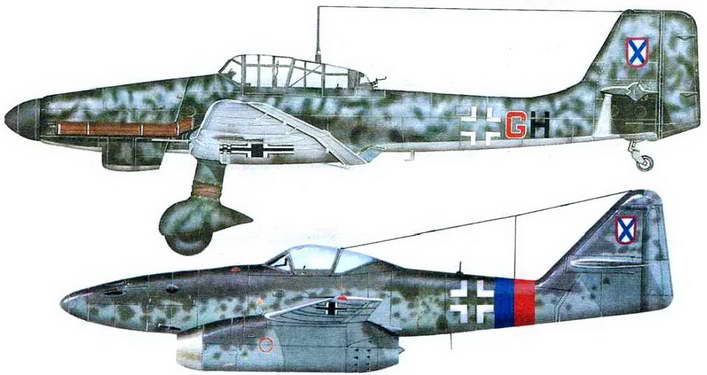 Следующей стала 2-я штурмовая эскадрилья (Schlachtstaffel 8) или «эскадрилья скоростных бомбардировщиков» капитана Б.Р.Антилевского. вооруженная 12 Ju87D. С учетом осложнявшейся ситуации на фронте ее вскоре перенацелили на ночную работу, соответственно обозначив 2-й эскадрильей ночных штурмовиков (Nachstchlahtstaffel 2). Она также перебазировалась в Немецкий Брод, откуда 13 апреля выполнила первые боевые вылеты на поддержку 1-й пехотной дивизии РОА. в ожесточенных боях пытавшейся задержать форсировавшие Одер советские войска. Тем временем в Хебе продолжалась организация 3-я разведывательной эскадрильи (капитана С.Артемова, первоначально оснащенная Fi156, но затем акценты в подготовке ее летного состава сместились в сторону истребителей и она получила рве спарки Bf109G-12 и столько же боевых Bf 109G-10. Позже в связи с планами по перевооружению истребительных частей Люфтваффе на реактивные машины, она сдала оба Bf 109G-T0 в эскадрилью майора Бычкова, получив в замен один Та 154 и два Ме262, выпуск которых налаживался тут же в Хебе. 4-я транспортная эскадрилья (Transportstaffel) м-ра М.Тарновского с парой юнкерсов Ju52/3m. Ее задачей, помимо обеспечения полка, предполагалась и высадка диверсантов в советском тылу. Последней стала 5-я учебно-тренировочная эскадрилья (Ausbildunqstaffel) «школы летчиков» подчиненная также Тарновскому и имевшая по два Bf 109, R156, У-2 и по одному Hel 11 и Do 17. Эти части, продолжавшие подготовку, на фронт не попали. Кроме того, в немецких документах упоминаются еще и 11 .Kampfstaffel с Hel 11 и Hs 129 и 14.Kurierstaffel с Fi156, но они, видимо, так и остались на бумаге. Одновременно в городке План разворачивался зенитный полк, в Куттенплане – парашютно-десантный батальон, а в Нойорне – батальон связи, также подчиненные ВВС РОА. Стараниями Ашенбреннера русские части ВВС были снабжены всем необходимым даже тогда, когда самим Люфтваффе отчаянно не хватало ни самолетов, ни боеприпасов. Сведения об участии в боях «соколов Мальцева» весьма скупы. За считанные недели до конца войны было не до оформления донесений и рапортов, а немногие свидетельства были утрачены в суматохе. Фактически известно лишь, что боевые вылеты истребителей и штурмовиков против наступающих частей Красной Армии имели место, но изменить ход событий и они уже не могли. Было безнадежно поздно. О сдаче в плен советским войскам не хотелось и думать – для всякого было очевидным, что разговор будет короток. 15 апреля 1945 г. Власов сообщил Мальцеву, что собирается выводить свои воинские формирования навстречу американцам в надежде выговорить приемлемые условия капитуляции. ВВС РОА следовало в течение трех дней осуществить переброску своих частей на подходящие аэродромы и сдать машины Ашенбреннеру. Немецкие летчики сдаваться не собирались, продолжая сражаться с отчаянием обреченных. Люфтваффе еще могла наносить чувствительные удары, отражая союзнический налет 19 апреля, их истребители сбили над Чехией пять «крепостей», через неделю жертвой одной их атаки под Коттбугом стали шесть советских штурмовиков. Схватки в воздухе продолжались едва ли не до последних минут войны. Например, свою последнюю победу майор Эрик Хартманн одержал утром 8 мая, сбив над Брно Як-3. Но превосходство союзников, ставших полновластными хозяевами неба, было подавляющим и устоять немцам не помогла даже реактивная техника, сосредоточенная в эти дни на чешских
