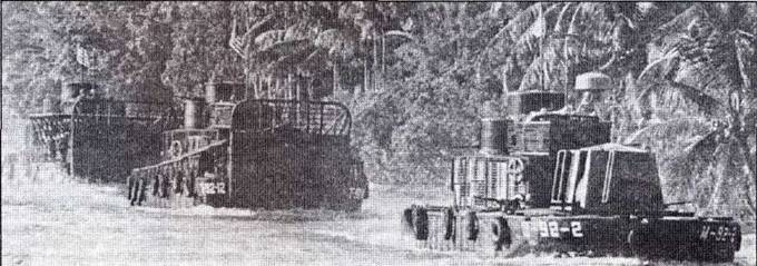 Монитор на базе LCM (6) возглавляет караван из бронированных десантных катеров ATC АТС зарекомендовали себя поистине универсальными кораблями. Они использовались по своему прямому назначению – для высадки десантов, а также для грузовых перевозок, огневой поддержки наземных войск, патрулирования, в качестве танкеров. В рамках проекта «Дач» на нескольких АТС установили водяные помпы, которые эффективно использовались для уничтожения прибрежных укреплений вьетконговцев. Самой же необычной модификацией стало переоборудование АТС в вертолетоносец АТС(Н). В передней части корпуса судна устанавливалась специальная площадка, на которую мог «притулиться» вертолет Белл UH-1B «Хью». Длина самого вертолета была ненамного меньше длины АТС. В 1968 году на АТС усилили вооружение, установив в центральной башне 40-мм автоматический гранатомет, а в бортовых башнях – 20-мм автоматические пушки. Если катера ASPB были речными эсминцами, то «линкорами» стали, конечно же, мониторы. За основу брался все тот же LCM(6) 1* корпуса закрывалась бронепалубой; на бронепалубе ставилась большая башня с 40-мм пушкой и 12,7-мм пулеметом. Вооружение, смонтированное на ходовой рубке, было аналогично вооружению АТС: три башни с 20-мм пушкой и 12,7-мм пулеметами. В открытом сверху трюме между носовой башней и рубкой стоял 81-мм миномет и два пулемета винтовочного калибра па бортовых шкворневых установках. Вместо аппарели оборудовалась остроконечная носовая часть; передняя часть В 1968 году мониторы прошли модернизацию, направленную на усиление вооружения. Носовую башню с 40-мм пушкой заменили на башню со 105-мм гаубицей М49. На ряде кораблей вся передняя часть закрывалась палубой, а в носу ставились две башни с огнеметами M108, на крыше рубки оставалась только одна пулеметная башня. «Огнеметные» мониторы традиционно назывались «Зиппо». В качестве флагманских кораблей дивизионов применялся еще один вариант LCM – корабль управления и связи ССВ. Практически это были тс же мониторы, но с более слабым вооружением. Вместо открытого трюма для миномета, на ССВ оборудовалось закрытое броней помещение, предназначенное для работы штаба дивизиона речных кораблей или пехотного батальона. На кораблях ССВ модификации Мк.II большую носовую башню с 40-мм пушкой сменила башня меньшего размера с одним пулеметом калибра 12,7 мм. Мониторы и корабли управления, так же как и АТС, оснащались решетками для защиты от РПГ. Все корабли на базе LCM имели навигационные РЛС и радиостанции УКВ диапазона. На СС.В устанавливалось девять радиостанций КВ и УКВ диапазона. Катера на базе «Майк»-ботов имели всего один недостаток, но увы, он был ключевым – малая скорость. Скорость в 6-8 узлов, которую могли развить эти корабли на полном ходу, оказалась недостаточной для оперативного реагирования на вылазки Вьет Конга. В состав 7-й эскадры вспомогательных кораблей входили две плавучие самоходные казармы (АРВ-35 «Бипева» и АРВ-36 «Коллетон»); плавучая мастерская ARL-30 «Аскари»; бывший танкодесантный корабль LST-854 «Кимпер Каунти», переоборудованный в склад расходуемых материалов. Кроме того, на этом корабле базировались четыре приданных 1* Корабли управления, десантные катера и мониторы оказались весьма удачной переделкой десантных кораблей типа LCM(6) постройки времен второй мировой войны. Эти катера в ВМС США прозвали "Майк" боты." .