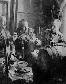 ФОТО-ВКЛАДЫШ К МОНОГРАФИИ СЕНЯВСКАЯ Е. С. ПСИХОЛОГИЯ ВОЙНЫ В ХХ ВЕКЕ: ИСТОРИЧЕСКИЙ ОПЫТ РОССИИ. М.: РОССПЭН, 1999. (между стр. 192–193) СПИСОК ИЛЛЮСТРАЦИЙ НА ВОЙНУ1–1. Проводы русских солдат на фронт. 1914 г. 1–2. В пути на фронт. Июль 1941 г. В БОЯХ И СРАЖЕНИЯХ2–1. Пехотная цепь идет в атаку. 1914 г. 2–2. «В бой за Родину!» 1941 г. 3–1. Пехота перед атакой. Лаоян. 1904 г. 3–2. Афганистан. Бой 4–1. На боевое задание. 1942 г. 4–2. Афганистан. После вылета 5–1. Сражение у Гайчжоу. 1904 г. Литография 1904 г. 5–2. Советские танки на улицах Берлина. 1945 г. 6–1. Бой под Гумбиненом. 1914 г. Литография 1914 г. 6–2. В атаку. 1943 г. 7–1. Бой у Вафангоу. 1904 г. Литография 1904 г. 7–2. В афганских горах 8–1. Русская батарея в действии. 1915 г. 8–2. «По фашистским захватчикам — огонь!» 1941 г. 9–1. Солдат спасает раненого офицера. 1914 г. Литография 1914 г. 9–2. Санинструктор оказывает первую помощь раненому. Июнь 1942 г. ФРОНТОВОЙ БЫТ10–1. В окопах. Волынская губерния. Октябрь 1916 г. 10–2. Афганистан. На привале 11–1. Первая мировая. Фронтовое хозяйство 11–2. Великая Отечественная. Будни войны 12–1. Гармонь. 1914 г. 12–2. В перерыве между боями. 1943 г. 13–1. Русская армия на отдыхе. Литография 1915 г. 13–2. Солдатское письмо. Западный фронт. 1941 г. 14–1. Офицеры. Октябрь 1916 г. 14–2. Блиндаж. 1942 г. 15–1. Великая Отечественная. Тревожные сны 15–2. Афганистан. Солдатский обед 16–1. На бивуаке. 1904 г. 16–2. Афганистан. Минуты отдыха 17–1. Первая мировая. В лазарете 17–2. Операция в полевом госпитале. 1943 г. ЖЕНЩИНЫ НА ВОЙНЕ18–1. Женский «батальон смерти» перед наступлением 18–20 июня 1917 г. 18–2. Зенитчицы принимают присягу. 1941 г. 19–1. Подвиг сестры милосердия Е. П. Коркиной. Литография 1915 г. 19–2. Афганистан. Сестренки ГЕРОИЧЕСКИЕ СИМВОЛЫ И ВОЕННАЯ ПРОПАГАНДА20–1. «Священная война!». Литография 1914 г. 20–2. «Во имя Родины — вперед, богатыри!» Советский плакат 1943 г. 21–1. Геройский подвиг и гибель летчика штабс-капитана П. Н. Нестерова. Литография 1914 г. 21–2. Листовка о подвиге В. Талалихина. 1941 г. 21–3. «Таран — оружие героев!» Советский плакат 1941 г. 22–1. Крейсер «Варяг». Литография 1904 г. 22–2. Сталинград. Дом Павлова 23–1. Генерал от кавалерии А. А. Брусилов. Литография 1915 г 23–2. Маршал Г. К. Жуков принимает Парад Победы. 24 июня 1945 г. 24–1. Первый Георгиевский кавалер — герой Кузьма Крючков. Литография 1914 г. 24–2. Герой Афганской войны. Из альбома «Мы — интернационалисты». Издательство «Плакат», 1987 г. 25–1. Первая мировая. Приехал полковой батюшка 25–2. Великая Отечественная. Политработник беседует с бойцами 26–1. Колонна пехоты на марше к линии фронта. Июнь 1941 г. 26–2. Афганистан. («Слава воинам-интернационалистам!») ОБРАЗ ВРАГА27–1. «Хоть мал да удал!» Литография 1904 г. 27–2. «Мешки» и «клещи». Советский плакат 1944 г. 28–1. Японский император и его сподвижники. Литография 1904 г. 29–1. «Не пугайтесь, милые, мы не немцы!» Литография 1914 г. 29–2. Победа немцев над казаками в Восточной Пруссии. Обложка немецкого журнала. 1914 г. 30–1. Конвоирование казаком немецких офицера и солдата, плененных под Гумбиненом. Август 1914 г. 30–2. Пленный. Берлин. 1945 г. 31–1. Советские солдаты перед плакатом о зверствах фашистских захватчиков. 1943 г. 31–2. У солдатской кухни. Жители Берлина получают горячую пищу. 1945 г. 32–1. Моджахед со «стингером» 32–2. Афганистан. Лицо Востока ИЛЛЮСТРАЦИИ НА ВОЙНУ Проводы русских солдат на фронт. 1914 г. В пути на фронт. Июль 1941 г. В БОЯХ И СРАЖЕНИЯХ Пехотная цепь идет в атаку. 1914 г. «В бой за Родину! Наше дело правое!» 1941 г. Пех