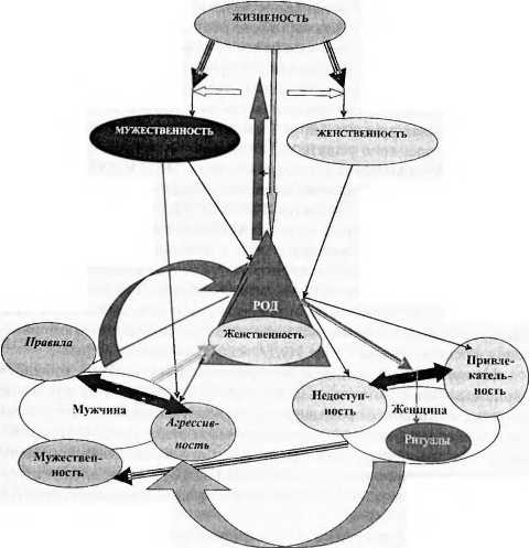 4. Тело рода Формирование тела ПОЛА, о котором мы говорили в прошлой главе — это только начало нашего «восхождения» в иерархии Кольца ЖИЗНИ. Пока у нас нет этого тела, мы свободны, бессмертны и почти неуязвимы, но мы не можем взаимодействовать ни с чем, происходящим внутри Кольца. Наша сфера существования — это только граница, по одну сторону которой противостоящий всему Живому мир ИНДИВИДУАЛЬНОСТИ, а по другую сторону — мир сущностей, «паразитирующих» на жизненной энергии. Само существование в пограничной зоне нам понятно, более того, это одна из основных форм нашего существования вообще. Всегда есть «враждебная территория», на которую мы боимся выйти, и почти всегда — ЗАПРЕТНАЯ ЗОНА, в которую мы просто не хотим проникать. Например, при взаимодействии с другими людьми, особенно в том случае, если это вынужденное взаимодействие. Пребывать с другим человеком в одной комнате, сохраняя при этом молчание и воздерживаясь от любых форм взаимодействия с ним — для человека это почти запредельная задача. Это уже взаимодействие на уровне Дельта-тела, мира ИНДИВИДУАЛЬНОСТИ, о котором мы много говорили и которое почти всегда оказывается разрушительным для одного из партнеров. Поэтому в громадном большинстве случаев мы установим какой-то контакт, даже если этот человек нам неприятен. С другой стороны, мы прекрасно ощущаем опасность, исходящую от чрезмерно близкого сближения. Для человека близость — это, прежде всего, возможность поделиться наболевшим. Теми переживаниями, которые как-то связаны с его личностью, вернее — с теми противоречиями, которые внутри него существуют. Проблема в том, что те же самые противоречия существуют и внутри нас. Не совсем те же, но раз мы можем понять его, значит, какие-то элементы его противоречий совпадают и с нашими элементами. Допустим, наш собеседник потерял любимого человека, потерял, потому что не смог удержать его, а у нас в этом плане все в порядке. Но мы ЗНАЕМ, что все, что происходит с другими людьми, в принципе может произойти и с нами. Та угроза, которая вчера была абстрактной и почти несуществующей, сегодня становится реальной, и она заставляет нас вспоминать те нюансы наших отношений, который свидетельствуют о том, что и у нас не все так гладко. Мы разрушаем идиллию внутри себя, а значит, становимся слабее и уязвимей. Разумеется, нам это не нравится, и мы никогда не пойдем на это по собственной воле. Подходя к другому слишком близко, мы всегда слишком близко подходим к себе самому, к своим собственным проблемам, о существовании которых мы и знать ничего не хотим. Поэтому сближение такого рода не менее опасно, чем взаимодействие на уровне ИНДИВИДУАЛЬНОСТИ. Конечно, все это относится к тому громадному большинству случаев, когда человек просто лишен внутреннего центра. Если же этот центр есть, то появляется возможность разрешить все внутренние противоречия, обрести целостность. И сделать это проще при взаимодействии с другим человеком. В этом случае ситуация меняется — есть стремление к абсолютной близости, к проникновению во все «потаенные места», потому приняв их в другом, мы примем их в самом себе, а значит — сможем избавиться от них. Но это редчайшее исключение из правил, а в обычном случае мы пребываем в той зоне, где другой человек не вызывает «резонанса», а его боль не становится нашей собствен