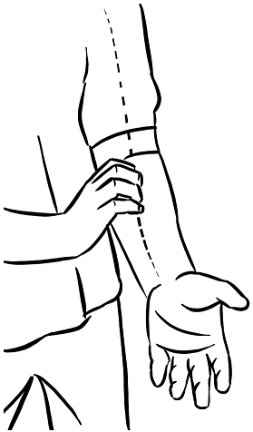 Хитори означает «самостоятельно», или «индивидуально», а риохо – «искусство исцеления». Это методы, которые позволяют активизировать кровообращение во всех частях тела, развить гибкость, помочь расслабиться и улучшить движение ки. Подобно йодо хо, эти методики исцеления важны для унификации сознания и тела в повседневной жизни. Напряженное, нездоровое тело не может реагировать даже на самое сосредоточенное сознание. Чтобы добиться вышеназванных целей, мы можем массировать тело с помощью приёмов ударной вибрации и растирания. Возможно также улучшить гибкость посредством ритмичных движений и растяжки. Но важнее всего, что мы можем посылать ки к различным частям тела, выполняя надавливания кончиками пальцев и фокусируя сознание на этой «инъекции ки» (юки). Возьмём для примера электромобиль. Он движется посредством батареи и электрической энергии. Если батарея слабая, мы используем соединительные кабели, чтобы зарядить её, запускаем батарею. Выполняя юки, представьте себе, что ваши кисти и пальцы – это соединительные кабели. Передачу ки различным частям тела можно сравнить с переливанием крови или быстрым запуском автомобиля. Полезно визуализировать эту трансфузию ки. На протяжении всей жизни Накамура продолжал совершенствовать эти целительные методики (и другие аспекты Шин-до). В результате существует несколько версий подобных приёмов. Поддержание здоровья – главная цель его упражнений. Иными словами, они равносильны профилактической медицине. Могут помочь восстановлению после травмы или болезни. 1. Упражнение «Вращение руки» Поднимите одну руку над головой, не поднимая неестественно плечо. Расслабьте кисть, руку и запястье. Затем позвольте руке (уде) опуститься вниз и вернуться в исходное положение, образуя узкий вытянутый овал, как на рисунке 15. Не выполняйте широкий круг, вместо этого позвольте руке опуститься вниз самопроизвольно. Вы можете вращать руку вперёд или назад. Благодаря силе реакции, если вы продолжаете расслабляться, ваша рука будет самопроизвольно подниматься вверх. Сфокусируйте своё внимание на движении вниз. Вспомните «американские горки». Когда вы спускаетесь вниз, машина ускоряет движение. Когда начинаете подниматься вверх, она постепенно замедляет ход, делая небольшую паузу в самой высокой точке перед тем, как возвратиться, быстро съезжая вниз со следующей горки. Используйте похожий естественный ритм, чтобы достичь в этом упражнении релаксации и координации сознания-тела. Вращательное движение руки освобождает плечи и усиливает кровообращение. Оно предназначено для того, чтобы не допускать или смягчать ригидность плеч и связанные с этим головные боли напряжения. Повторите столько раз, сколько вам будет удобно и необходимо. Одинаково работайте на обеих сторонах. Данный совет также касается всех последующих упражнений. ![]() Рисунок 15 Это упрощённая версия упражнения по вращению руки. Можно выполнить более трудное вращение поочередно обеими руками. 2. Массаж плеч Сожмите свободный кулак, подвернув большой палец под остальные пальцы вашей кисти (рисунок 16). Дотянитесь до противоположного плеча на расстоянии 30 см над плечевыми мышцами. Затем, концентрируя внимание на движении вниз, опустите кулак ладонью вниз на плечо (ката). Если вы полностью расслабитесь, то кулак вновь поднимется самоп